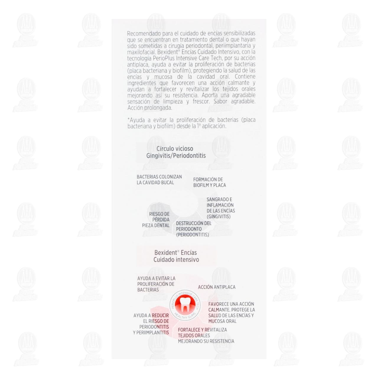Precauciones: No ingerir. Mantener fuera del alcance de los niños. En algunos casos puede presentarse alteración del gusto y sensación urente en la lengua, que generalmente disminuyen con el uso continuo del producto. No lo use si ha mostrado una reacción de hipersensibilidad a la clorhexina. No lo use si es alérgico a alguno de los ingredientes de Bexident Encias Cuidado Intensivo. Tras el uso prolongado y al contacto con ciertas bebidas y alimentos tales como vino tinto y café, y también como el tabaco, puede pesentarse coloración de dientes y de las restauraciones. Esta coloración no es permanente y puede eliminarse con una profilaxis en la clínica dental.Detalles del producto