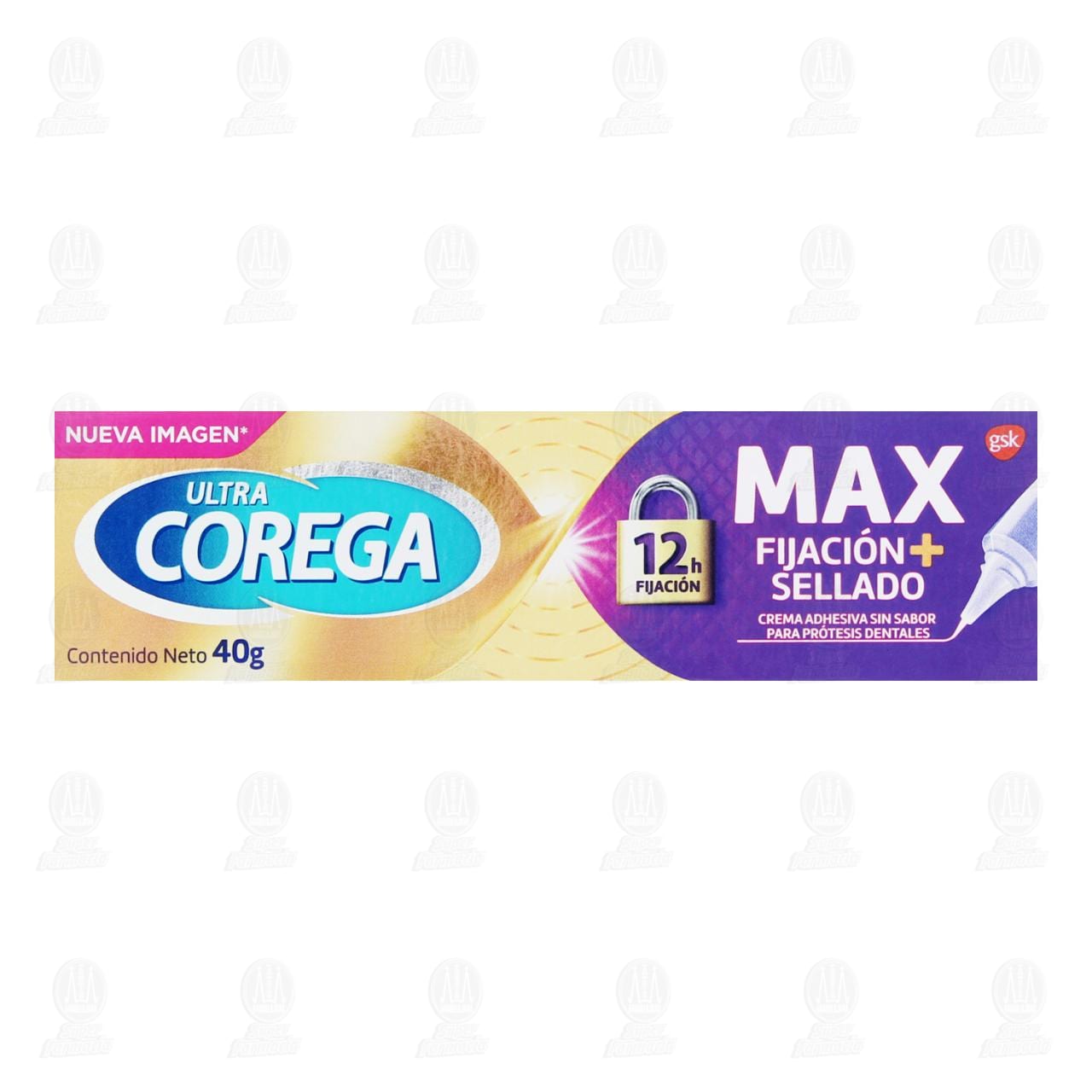 Crema adhesiva Ultra Corega Máximo Sellado para prótesis dentales sin sabor, ayuda a bloquear la entrada de comida. Contiene 40 gramos.