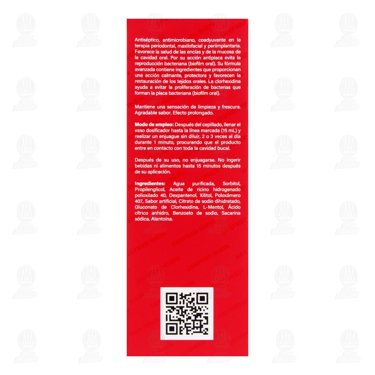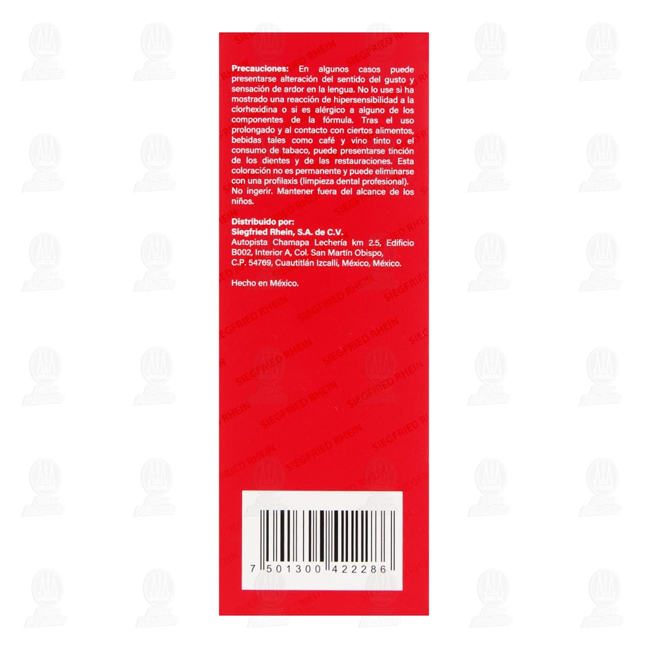 En algunos casos puede presentarse alteración del sentido del gusto y sensación de ardor en la lengua. No lo use si ha mostrado una reacción de hipersensibilidad a la clorhexidina o si es alérgico a alguno de los componentes de la fórmula. Tras el uso prolongado y al contacto con ciertos alimentos, bebidas tales como café y vino tinto o el consumo de tabaco, puede presentarse tinción de los dientes y de las restauraciones. Esta coloración no es permanente y puede eliminarse con una profilaxis (limpieza dental profesional). No ingerir. Mantener fuera del alcance de los niños.Detalles del producto