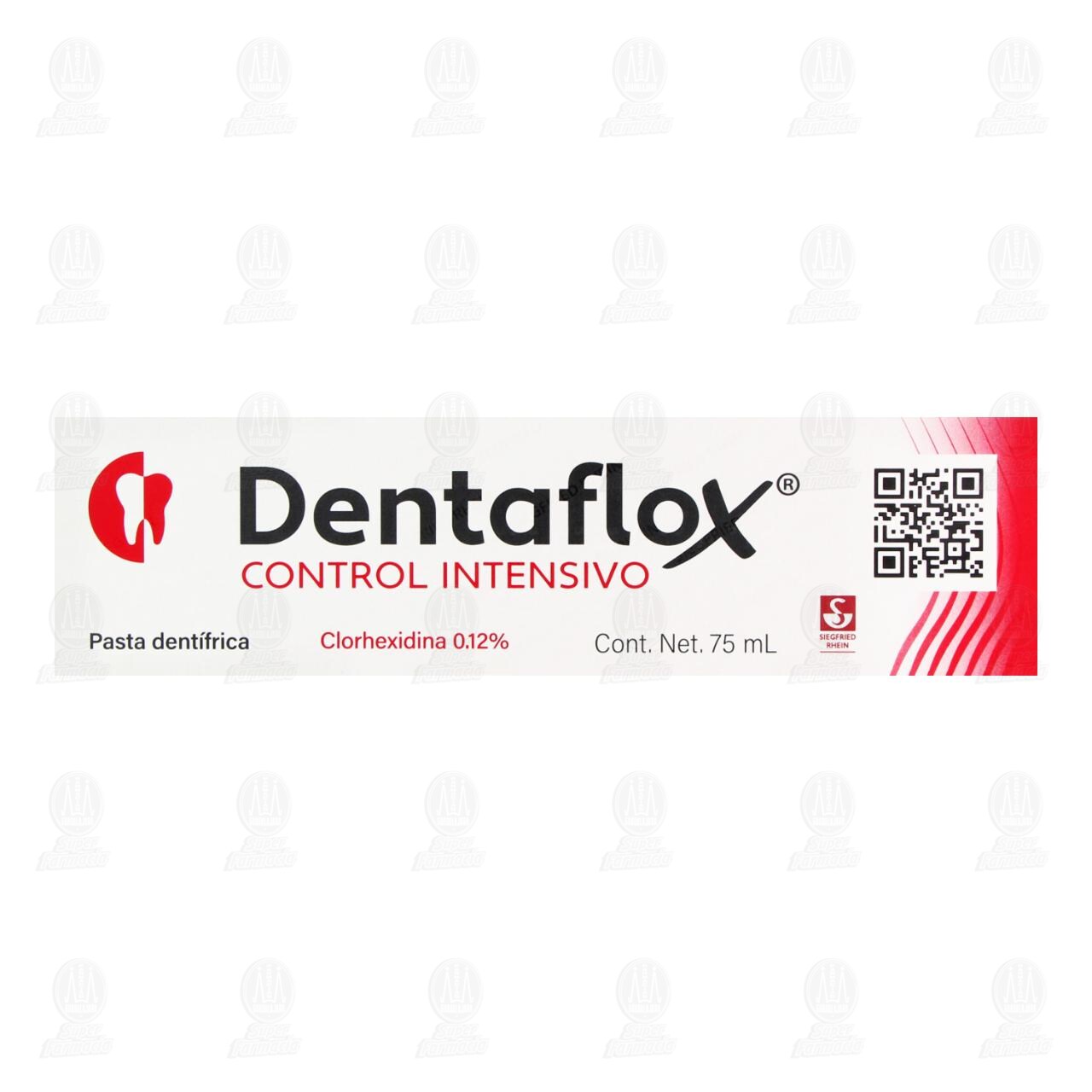 Dentaflox Control Intensivo Pasta Dentífrica con Clorhexidina al 0.12% indicada como coadyuvante en el control de la placa dentobacteriana. Contiene 75 mililitros.