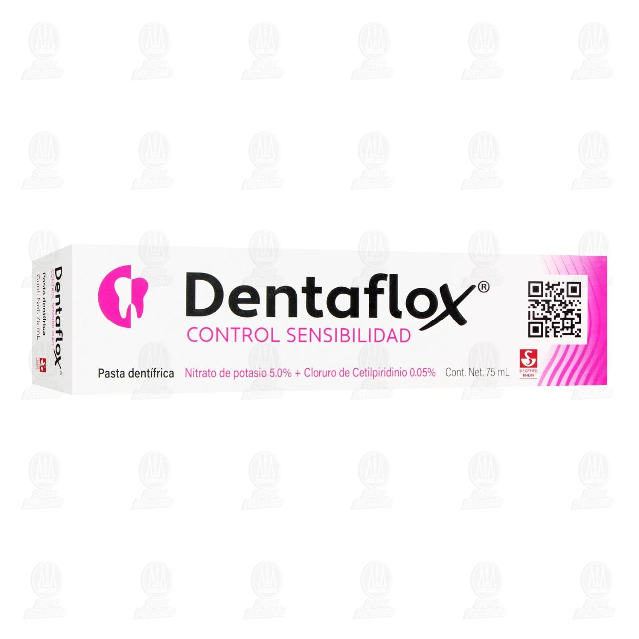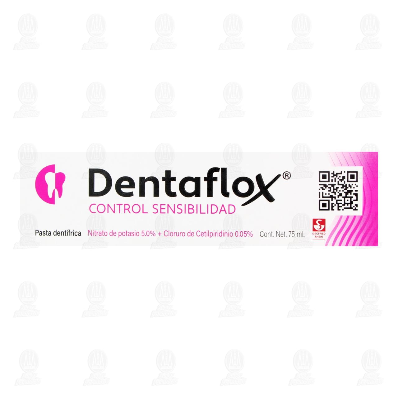 Pasta dentífrica Dentaflox Control Sensibilidad con nitrato de potasio al 5.0% y cloruro de cetilpiridinio al 0.05% para el cuidado bucal diario. Contiene 75 mililitros.