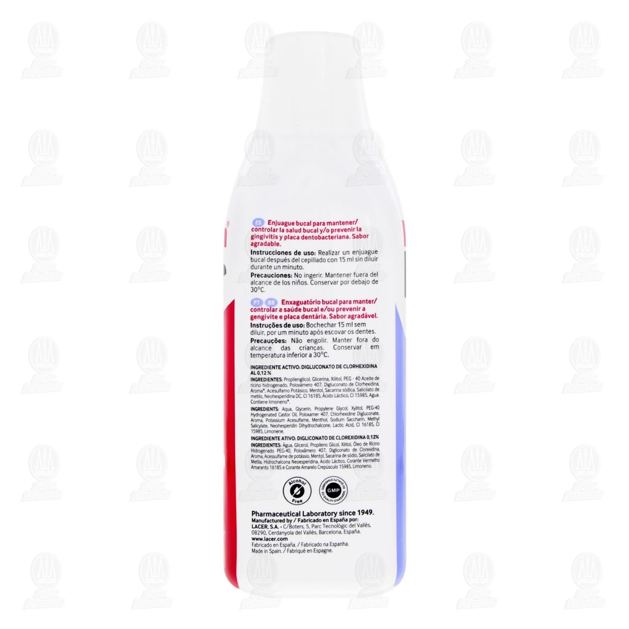 Enjuague Bucal Perioxidin Lacer con clorhexidina al 0.12%, auxiliar en el tratamiento de la enfermedad periodontal como gingivitis y periodontitis. Contiene 500 mililitros.