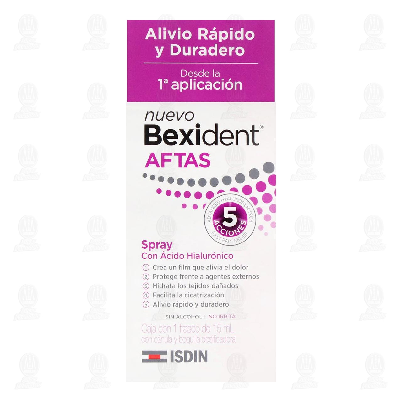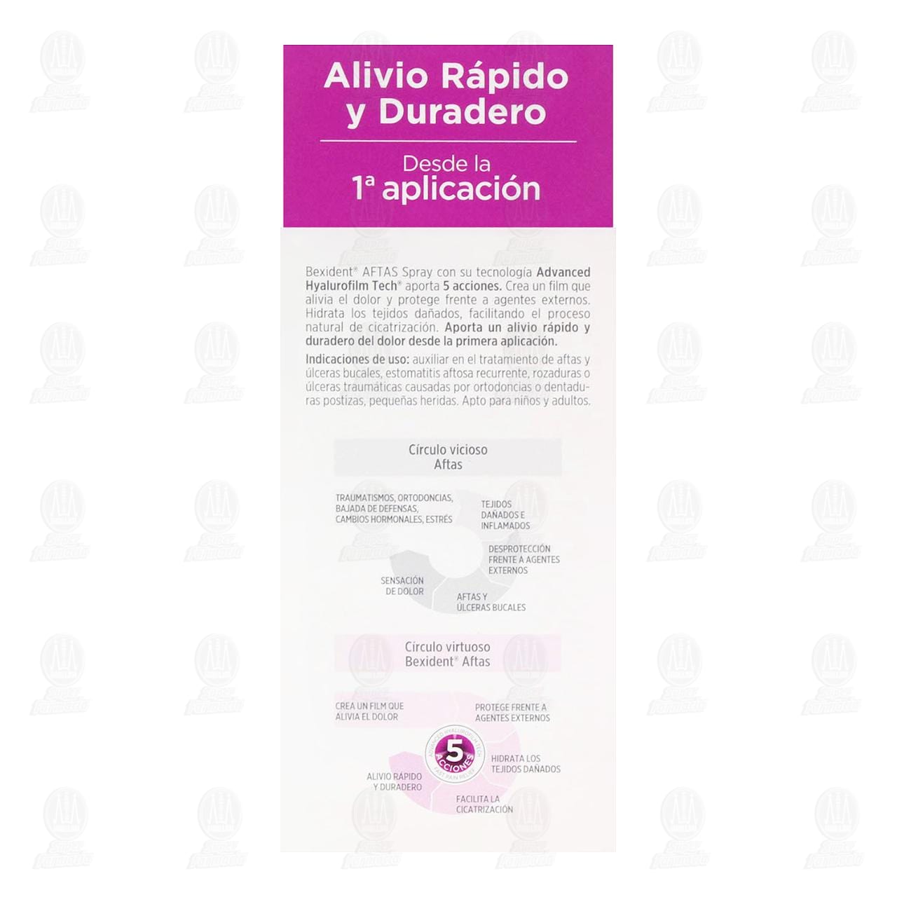 Bexident Aftas Spray, con Tecnología Advanced Hyalurofilm Tech, Aporta 5 Acciones. Crea un Película que Alivia el Dolor y Protege Frente a Agentes Externos. Hidrata los Tejidos Dañados, Acelerando el Proceso Natural de Cicatrización.