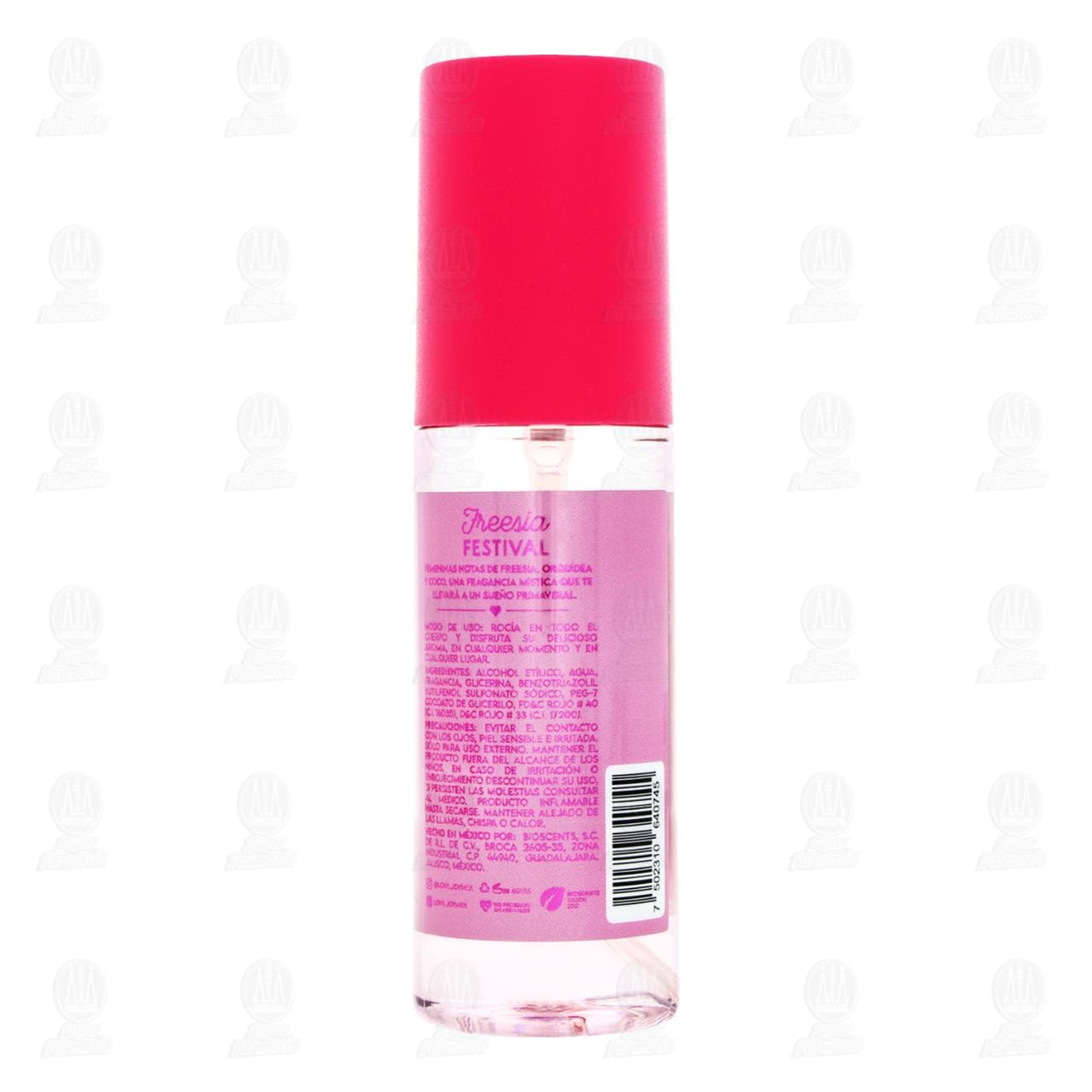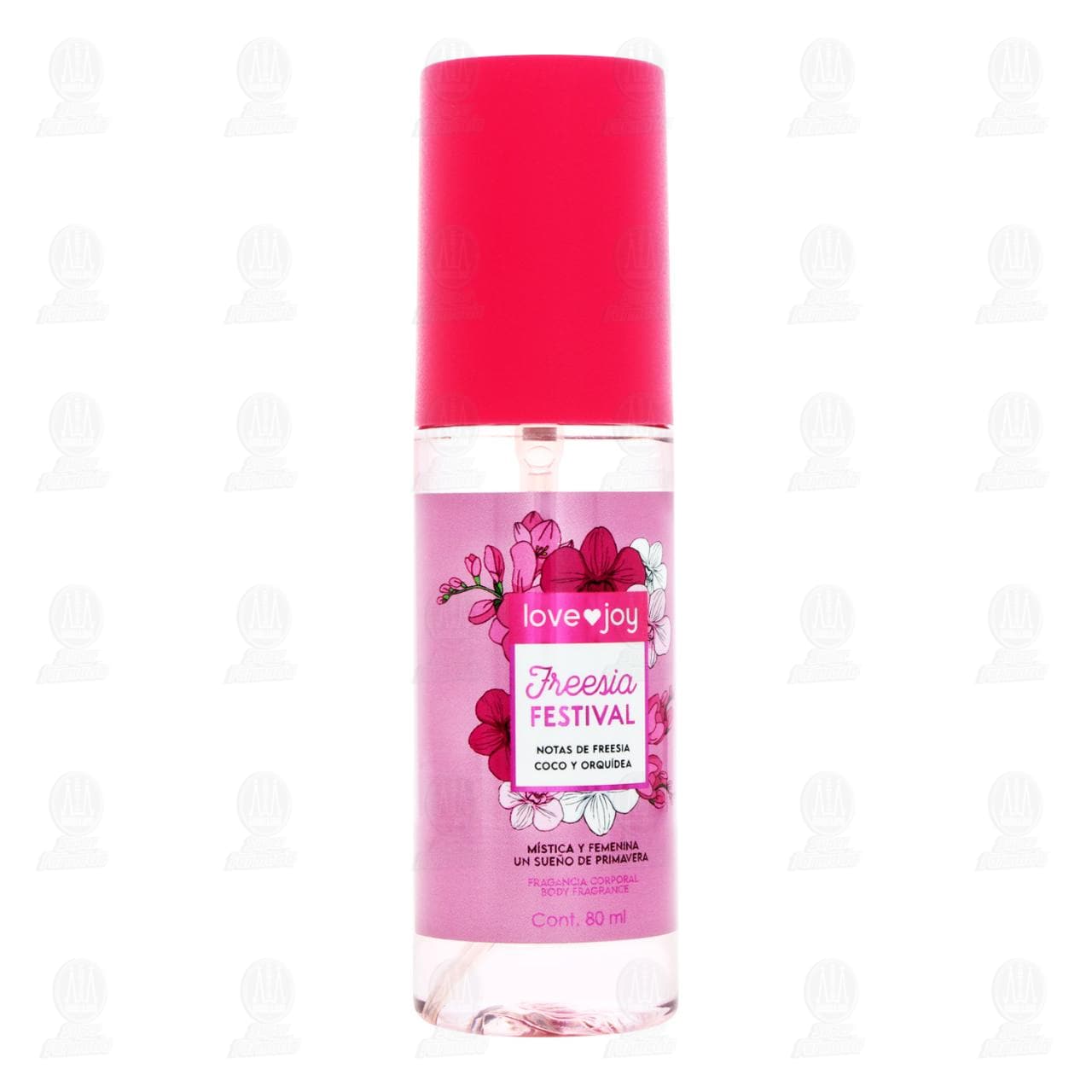 Fragancia Corporal Love Joy Festival femeninas notas de freesia, coco y orquídea una fragancia mística que te llevara a un sueño primaveral. Frasco con 80 mililitros.
