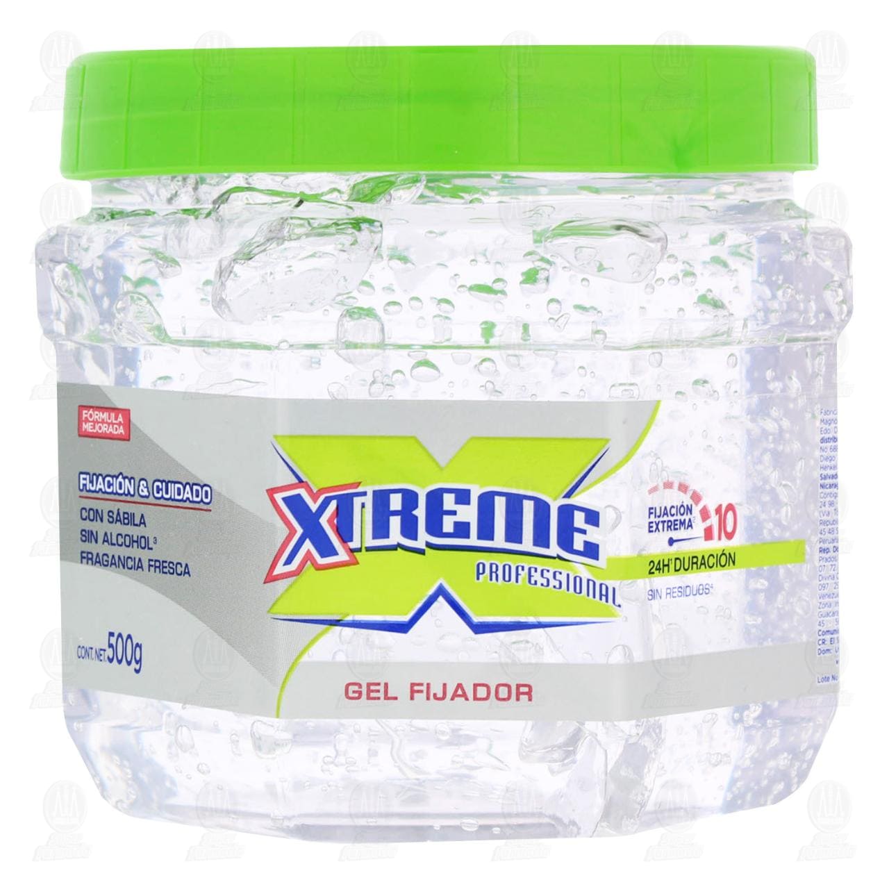 Gel fijador para el cabello Xtreme Professional con sábila, fijación extrema hasta por 24 horas que no deja residuos. Envase con 500 gramos.
