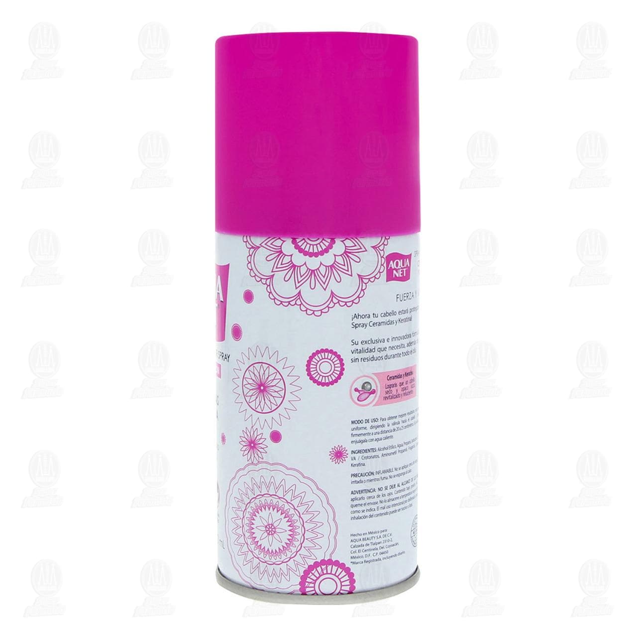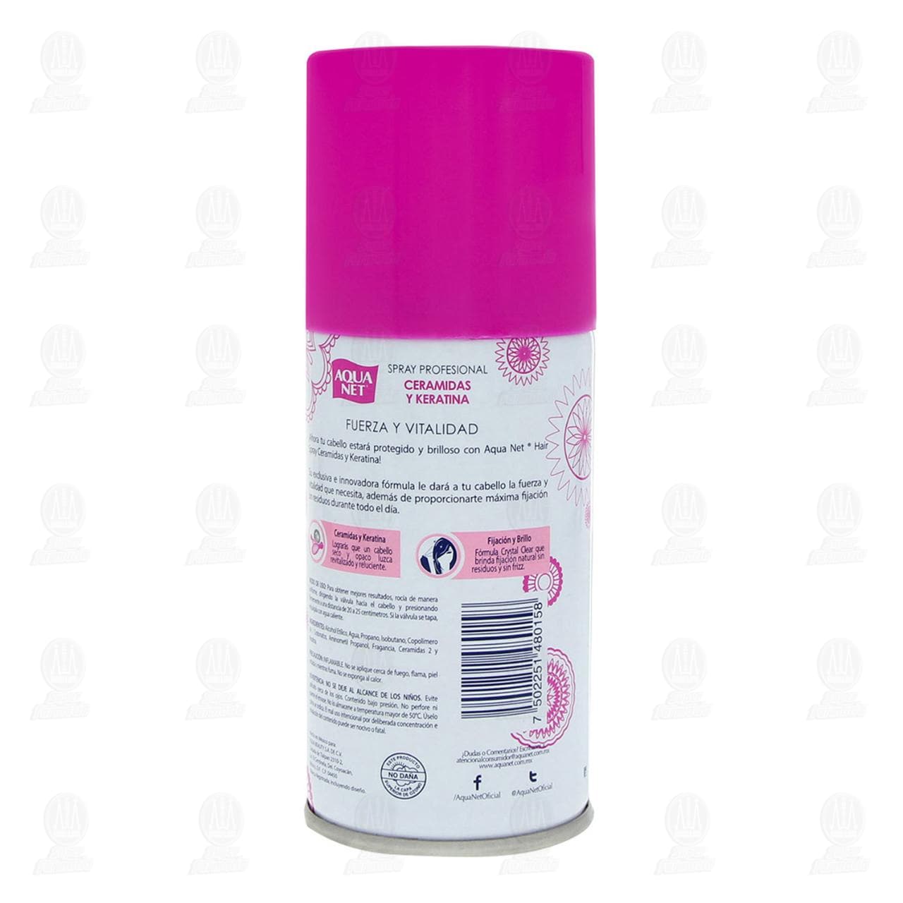 Fijador para cabello Aqua Net Professional, spray con extra fijación, contiene ceramidas y keratina para brindar fuerza y vitalidad. Envase con 100 mililitros.