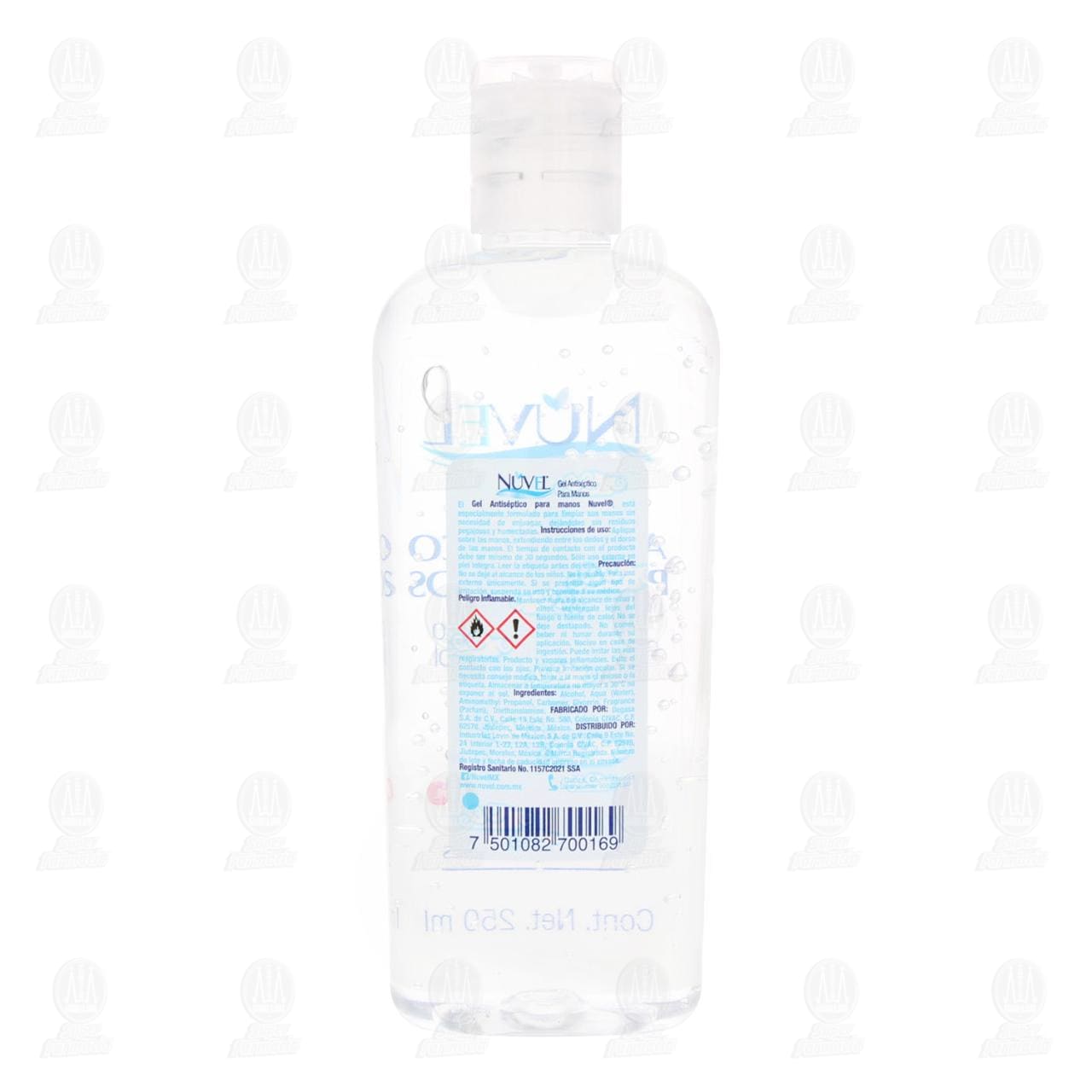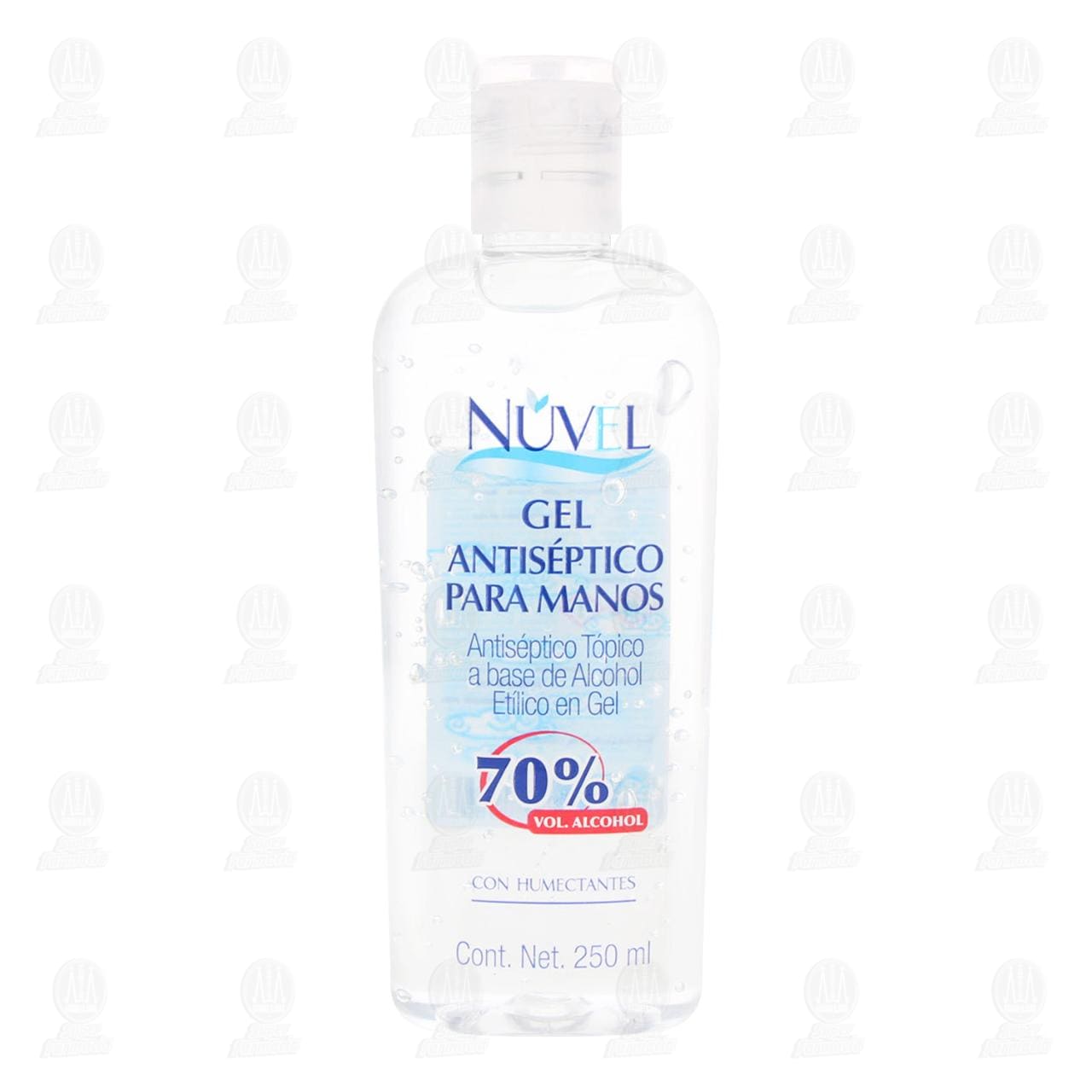 Gel antiséptico tópico Nuvel para manos, fórmula a base de alcohol etílico al 70%, diseñado para limpiar sus manos sin necesidad de enjuagar, dejándolas sin residuos pegajosos y humectadas. Envase con 250 mililitros.