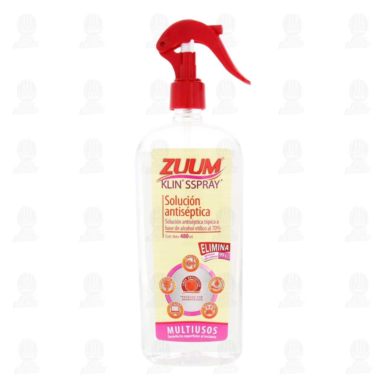 Solución antiséptica tópica Zuum Klin Sspray Multiusos para manos y superficies que no requiere enjuague, formulado a base de alcohol etílico al 70%, desinfecta superficies al instante. Envase con 480 mililitros.