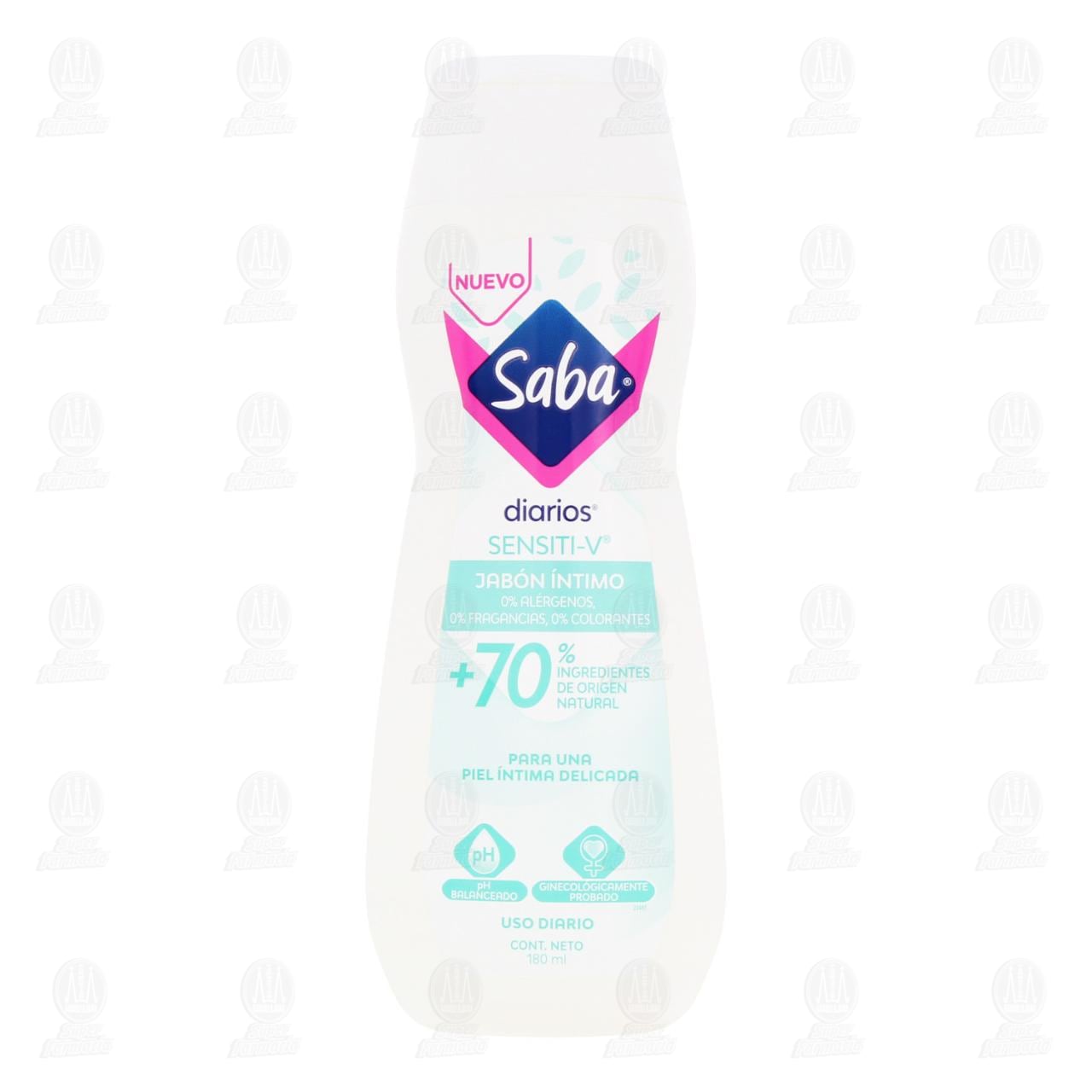 Jabón Íntimo Saba Diarios Sensiti-V para una Piel Íntima Delicada, De uso Diario. Envase con 180 mililitros.