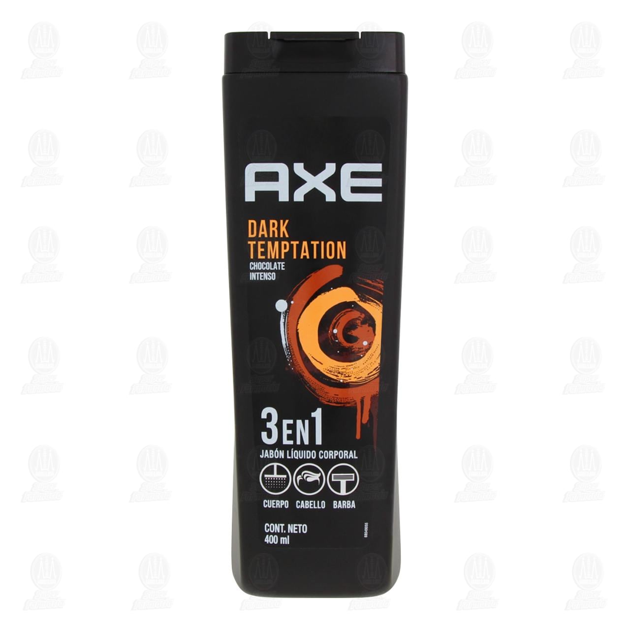 Jabón líquido corporal Axe Dark Temptation para cuerpo, cabello y barba (3 en 1), fragancia chocolate intenso. Envase con 400 mililitros.