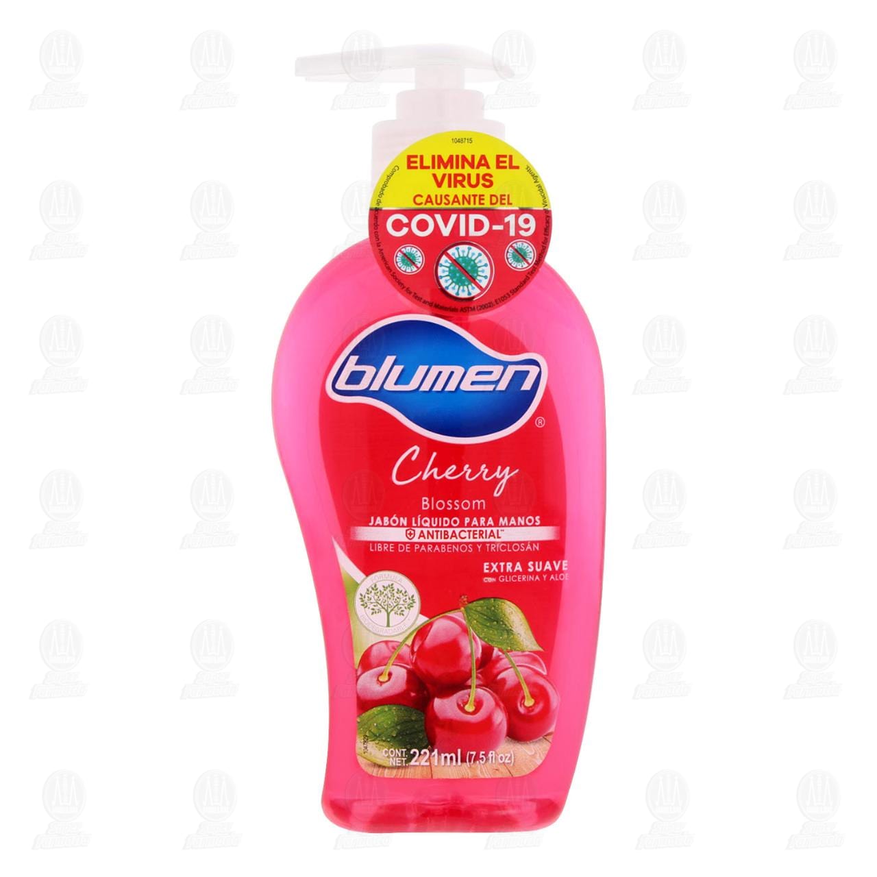 Jabón líquido Blumen para manos, aroma a Cherry Blossom, formulado con emolientes que dejan tus manos limpias y suaves, con glicerina y aloe. Envase con 221 mililitros.