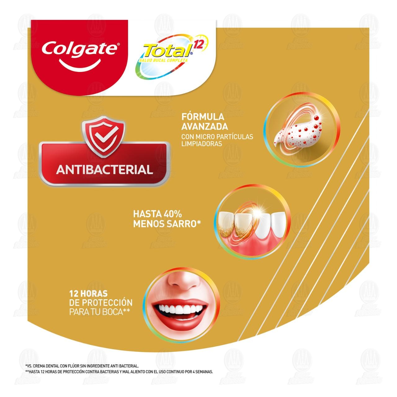 Luce una sonrisa sana y reduce las bacterias en los dientes, mejillas y encías con la pasta de Colgate Total Antisarro con una espuma densa y micropartículas que ayudan a prevenir la acumulación de sarro dental. Contiene 75 mililitros.