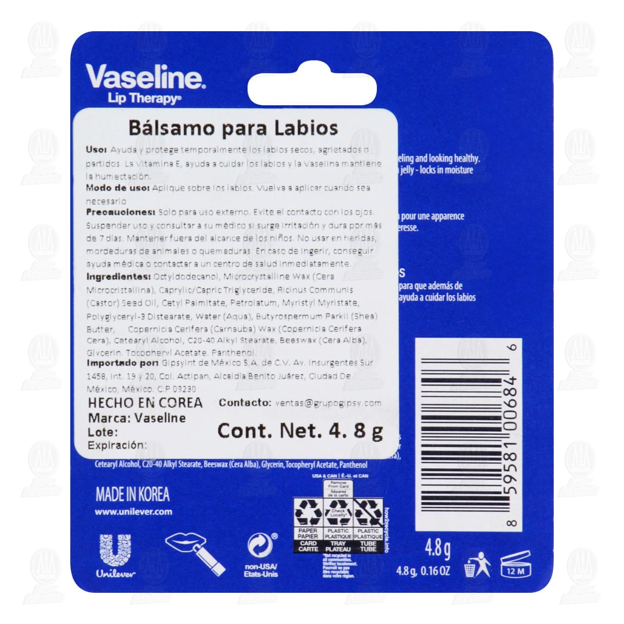 Bálsamo para Labios Vaseline Lip Therapy Original Ayuda y Protege Temporalmente los Labios Secos, Agrietados o Partidos. Contiene 4.8 gramos.