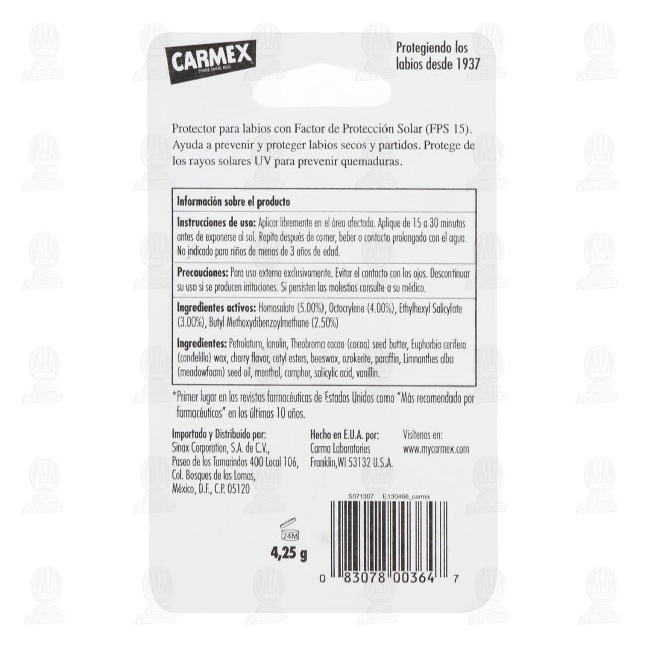 Carmex Barra Cereza 4.25 gr es un bálsamo de textura y aroma deliciosos. Te encantará este bálsamo hidratante que protege tus labios dejándolos perfectamente suaves, hidratados y protegidos gracias a su SPF (Filtro Solar) 15.