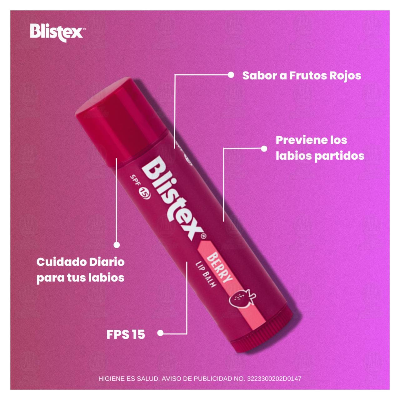 Protector Labial Blistex Cuidado Diario Frutos Rojos, con Protección solar FPS 15 que permite la exposición al Sol con menos Riesgos de Quemaduras. Contiene 4.2 gramos.