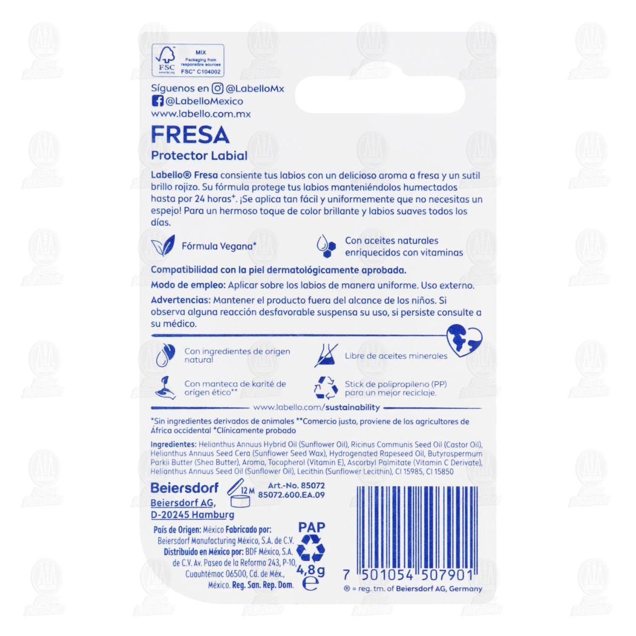 Protector Labial Labello Fresa 24h Humectación con un Delicioso Aroma y un Sutil Brillo Rojizo, Su Fórmula Protege tus Labios Manteniéndolos Humectados Hasta por 24 Horas. Contiene 4.8 gramos.