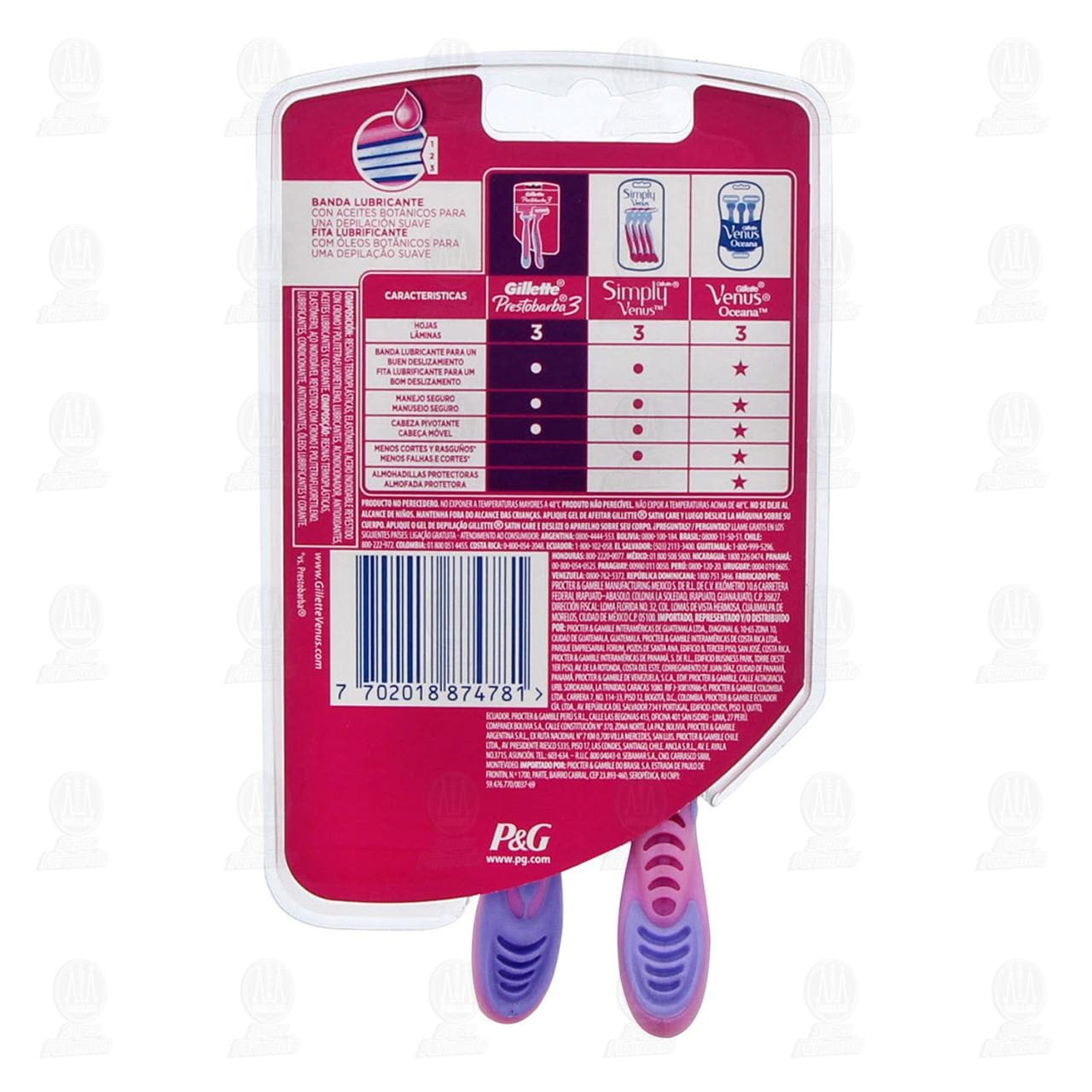 Máquinas para afeitar Gillette Prestobarba3 desechables para dama, banda lubricante con aceites botánicos para una depilación suave. Contiene 2 piezas.