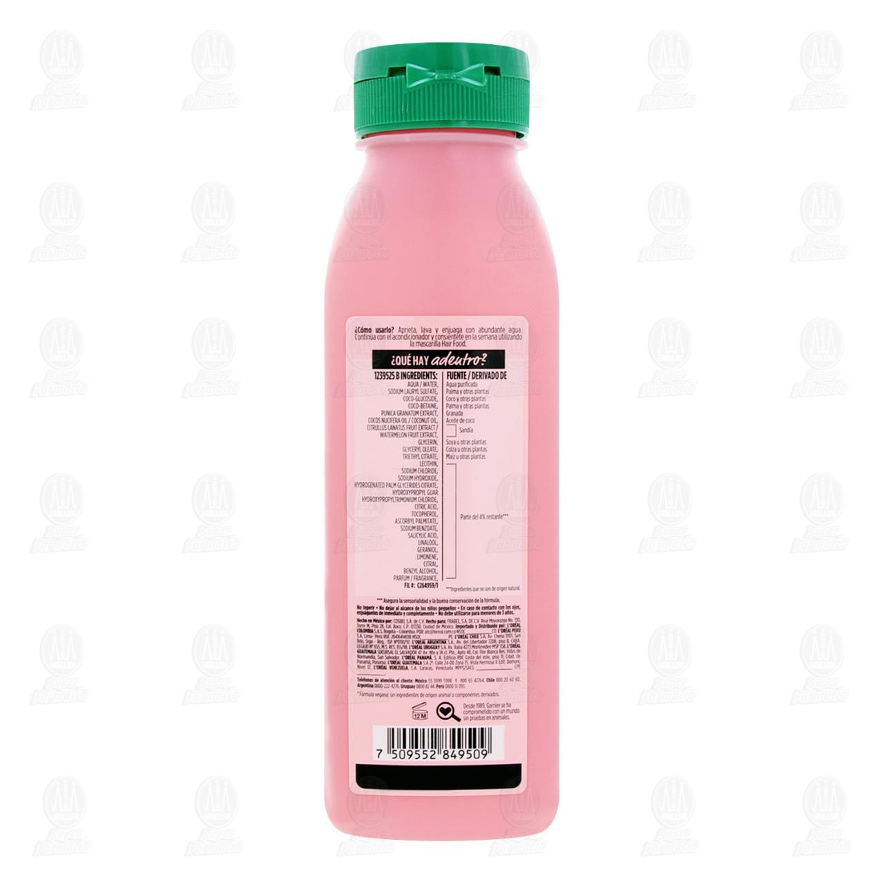 Shampoo Garnier Fructis Hair Food para cabello normal, fórmula enriquecida con extracto de sandía e ingredientes 96% de origen natural que revitalizan el cabello dejándolo brillante y lleno de vida. Envase con 300 mililitros.