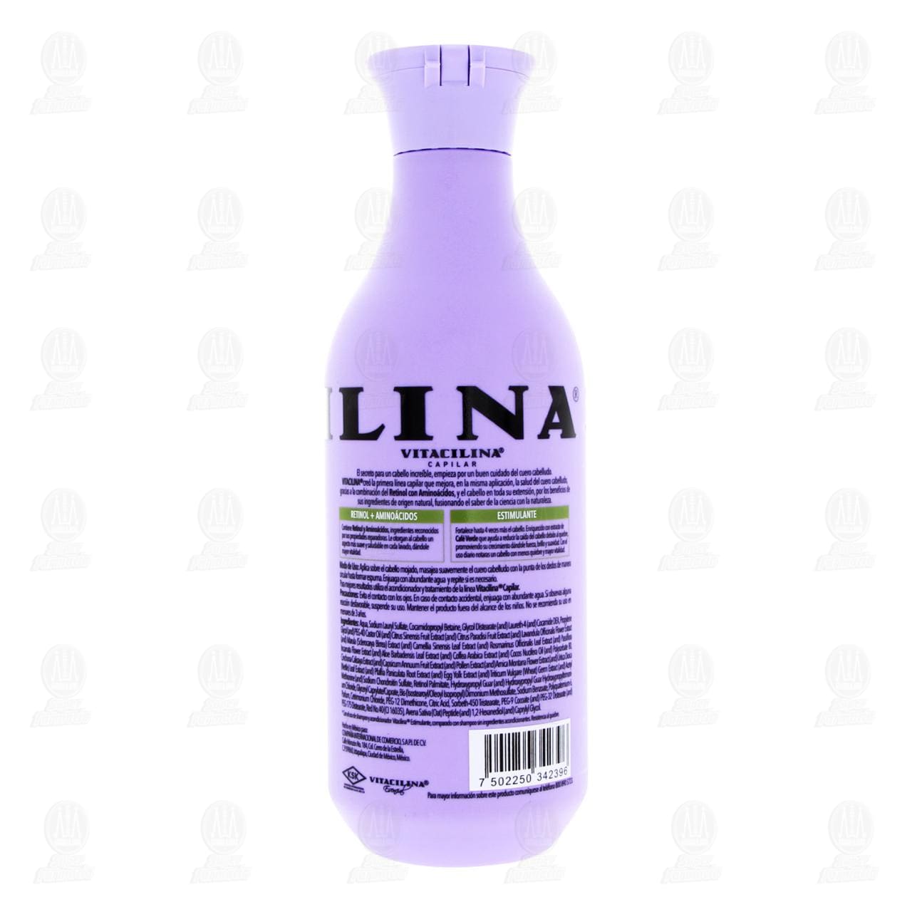 Vitacilina Shampoo Capilar Estimulante Retinol para cabello débil y con caída +aminoácidos +café verde, Mejora la salud del cuero cabelludo gracias a la combinación del retinol con aminoácidos. Envase con 400 mililitros.
