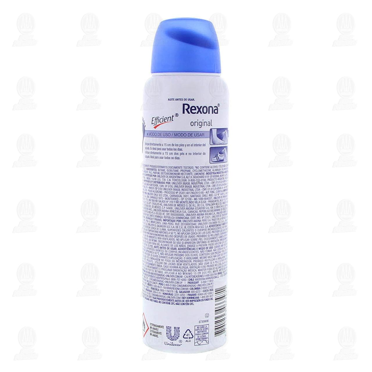 Desodorante Rexona Efficient Original para pies en aerosol eficaz por 24 horas. No contiene alcohol. Envase con 153 mililitros/ 88 gramos.