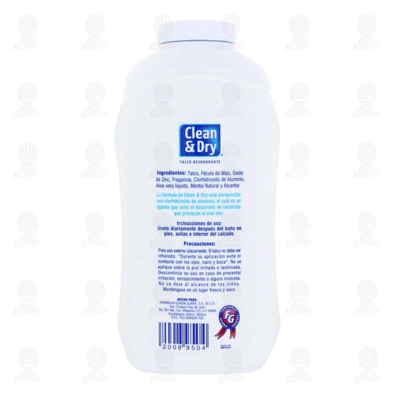 Talco desodorante Clean & Dry para toda la familia, fórmula enriquecida con clorhidróxido de aluminio, el cual es un agente que evita el desarrollo de bacterias que provocan el mal olor, eficaz las 24 horas. Bote con 320 gramos.