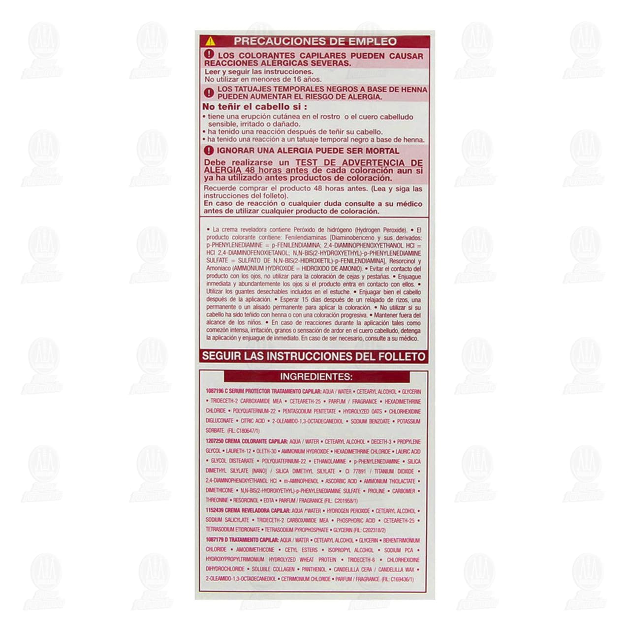Los colorantes capilares pueden causar reacciones alérgicas severas. Leer y seguir las instrucciones. No utilizar en menores de 16 años. Los tatuajes temporales negros a base de henna pueden aumentar el riesgo de alergia. No teñir el cabello si: -Tiene una erupción cutánea en el rostro o el cuero cabelludo sensible, irritado o dañado. -Ha tenido una reacción después de teñir su cabello. -Ha tenido una reacción a un tatuaje temporal negro a base de henna. Ignorar una alergia puede ser mortal. Debe realizarse un test de advertencia de alergia 48 horas antes de cada coloración aun si ya ha utilizado antes productos de coloración. Recuerde comprar el producto 48 horas antes. (Lea y siga las instrucciones del folleto). En caso de reacción o cualquier duda consulte a su médico antes de utilizar un producto de coloración. La crema reveladora contiene: peróxido de hidrógeno (hydrogen peroxide). El producto colorante contiene: fenilendiaminas [(diaminobenceno y sus derivados: p-phenylenediamine=p-fenilendiamina, 2,4-diaminophenoxyethanol HCl=HCl 2,4-diaminofenoxietanol, hydroxypropyl bis(n-hydroxyethyl-p-phenylenediamine) HCl=HCl hidroxipropil bis(n-hidroxietil-p-fenilendiamina)], resorcinol y amoniaco (ammonium hydroxide=hidróxido de amonio). Evitar el contacto del producto con los ojos, no utilizar para la coloración de cejas y pestañas. Enjuague inmediata y abundantemente los ojos si el producto entra en contacto con ellos. Utilizar los guantes desechables incluidos en el estuche. Enjuagar bien el cabello después de la aplicación. Esperar 15 días después de un relajado de rizos, una permanente o un alisado permanente para aplicar la coloración. No utilizar si su cabello ha sido teñido con henna o con una coloración progresiva. Mantener fuera del alcance de los niños. En caso de reacciones durante la aplicación tales como comezón intensa, irritación, granos o sensación de ardor en el cuero cabelludo, detenga la aplicación yDetalles del producto
