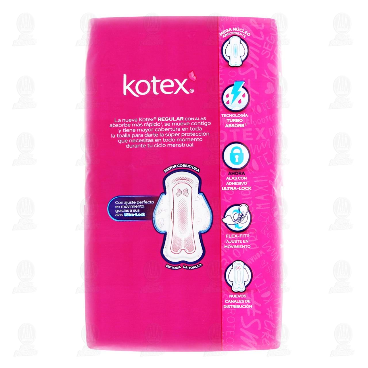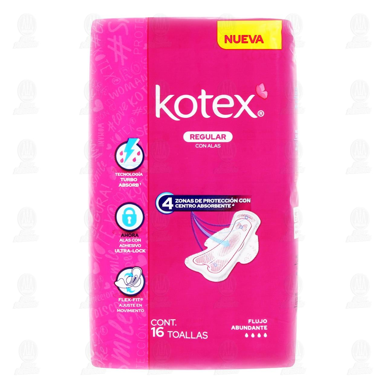 Toallas Femenina Kotex Regular con Alas para Flujo Abundante, Absorbe más Rápido y Tiene Mayor Cobertura en Toda la Toalla para Darte la Súper Protección que Necesitas en Todo Momento. Paquete con 16 Toallas.