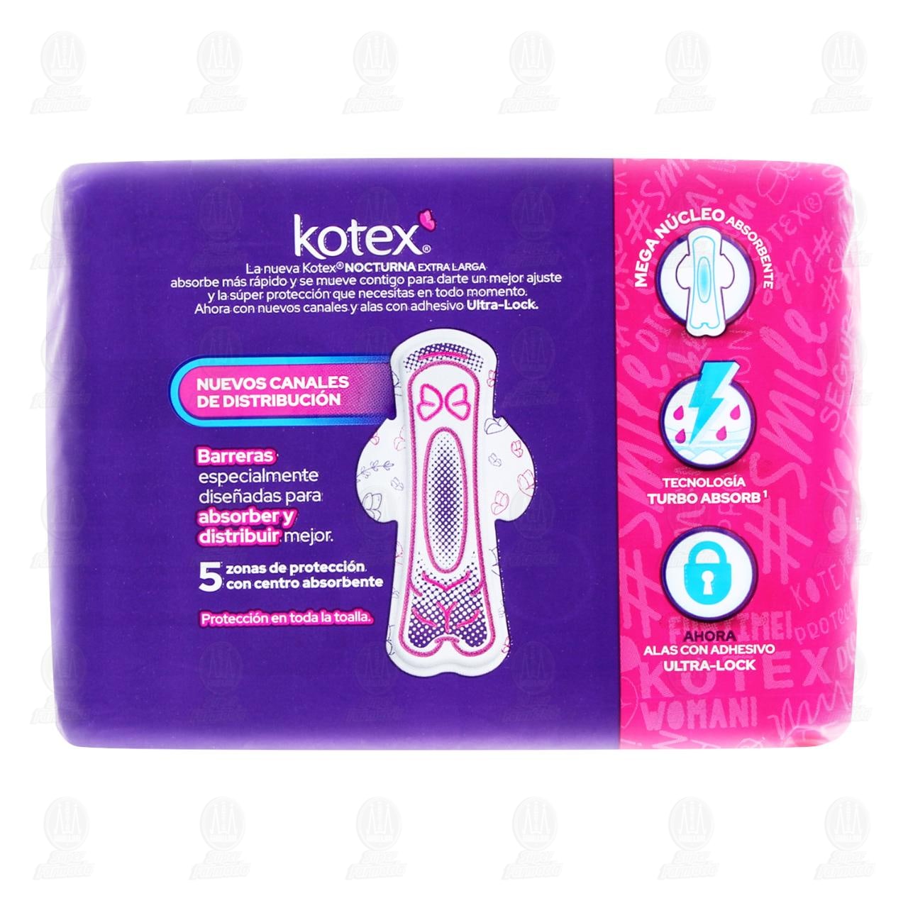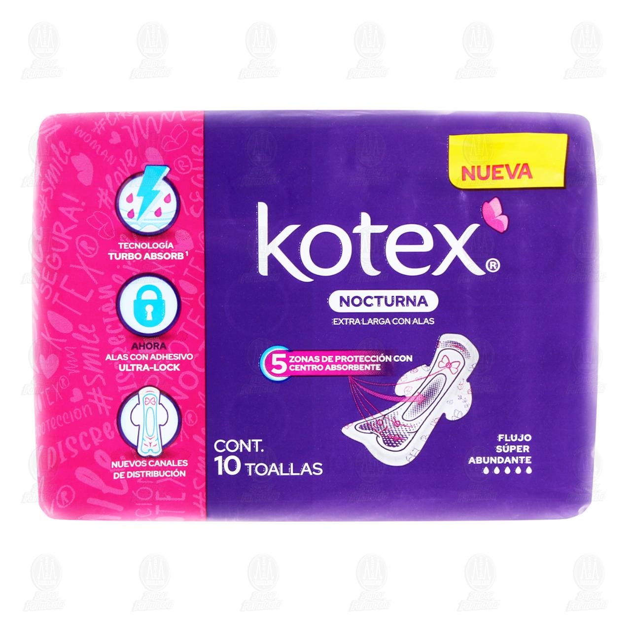 Toallas Femeninas Kotex Nocturna Extra Larga con Alas para Flujo Súper Abundante, Absorbe más Rápido y se Mueve Contigo para Darte un Mejor Ajuste y la Súper Protección que Necesitas en Todo Momento. Paquete con 10 Toallas.