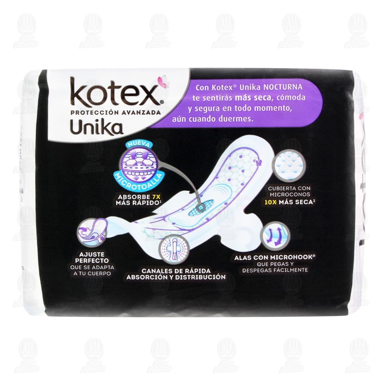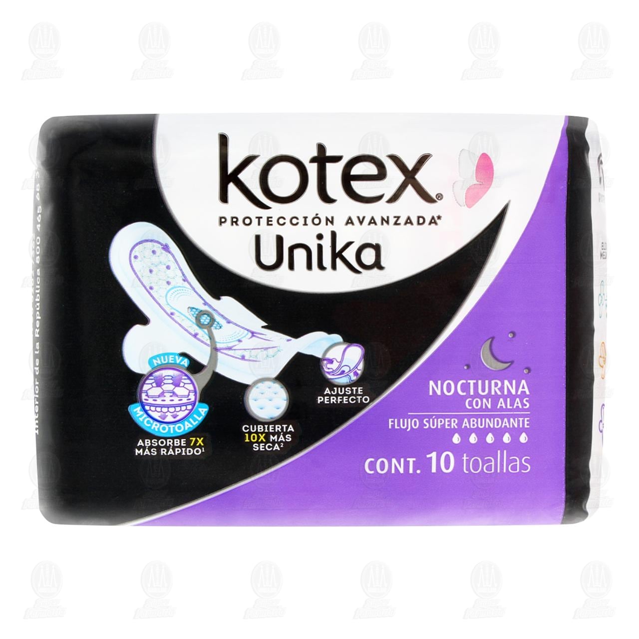 Toallas Femeninas Kotex Unika Protección Avanzada Nocturna con Alas para Flujo Súper Abundante te Sentirás más Seca, Cómoda y Segura en todo Momento, Aún Cuando Duermes. Paquete con 10 Toallas.