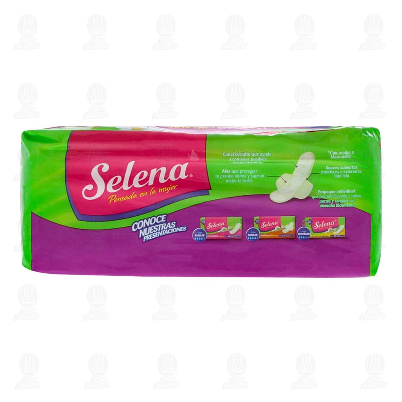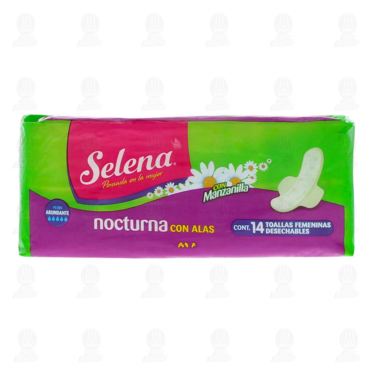 Las toallas femeninas Selena Nocturna ayudan a contener escurrimientos gracias a su canal circuito, además contiene suaves cubiertas tipo tela. Cuenta con manzanilla para el control de olor y alas para un mejor ajuste.