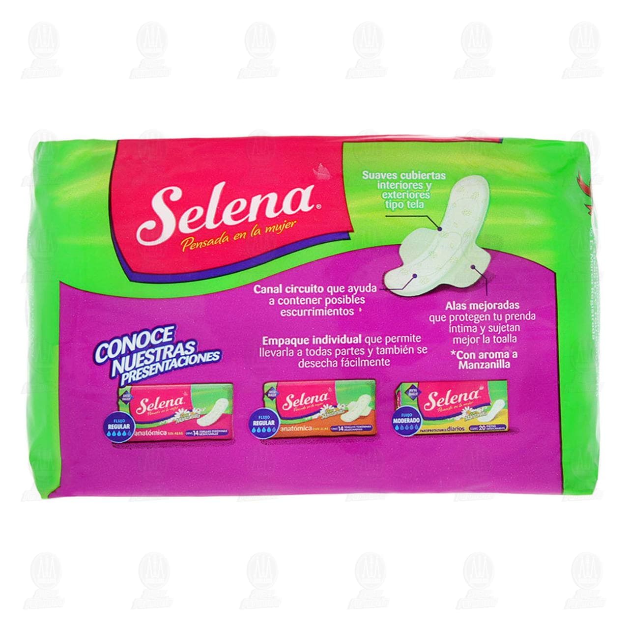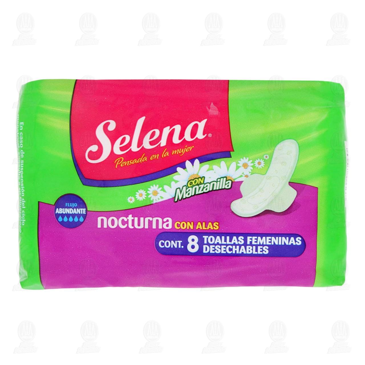 Las toallas femeninas Selena Nocturna ayudan a contener escurrimientos gracias a su canal circuito, además contiene suaves cubiertas tipo tela. Cuenta con manzanilla para el control de olor y alas para un mejor ajuste.