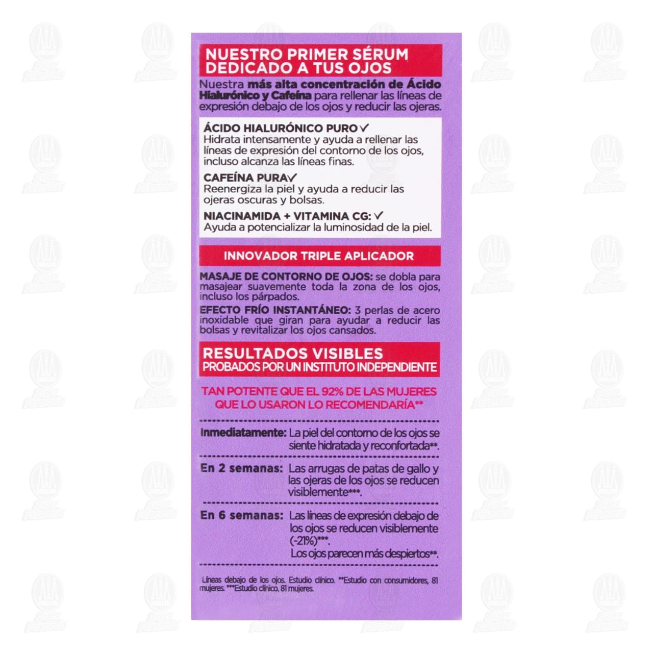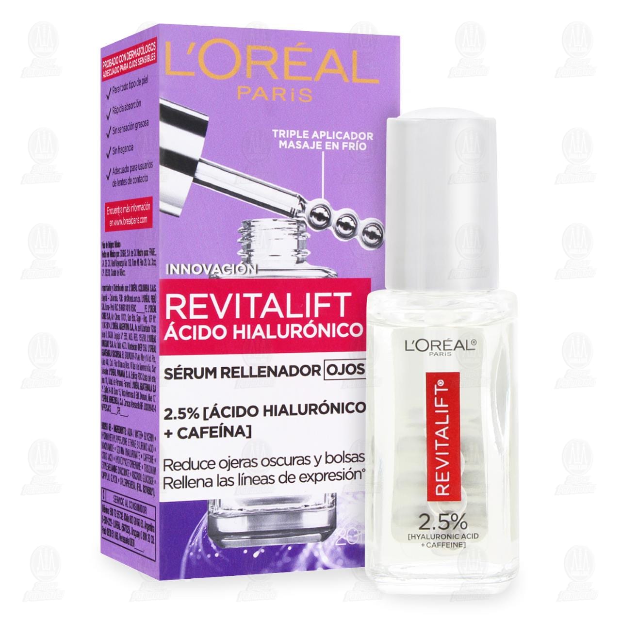 Sérum rellenador L'Oréal Paris Revitalift con ácido hialurónico puro, cafeína pura y niacinamida + vitamina CG, para rellenar las líneas de expresión debajo de los ojos y reducir las ojeras. Contiene 20 mililitros.