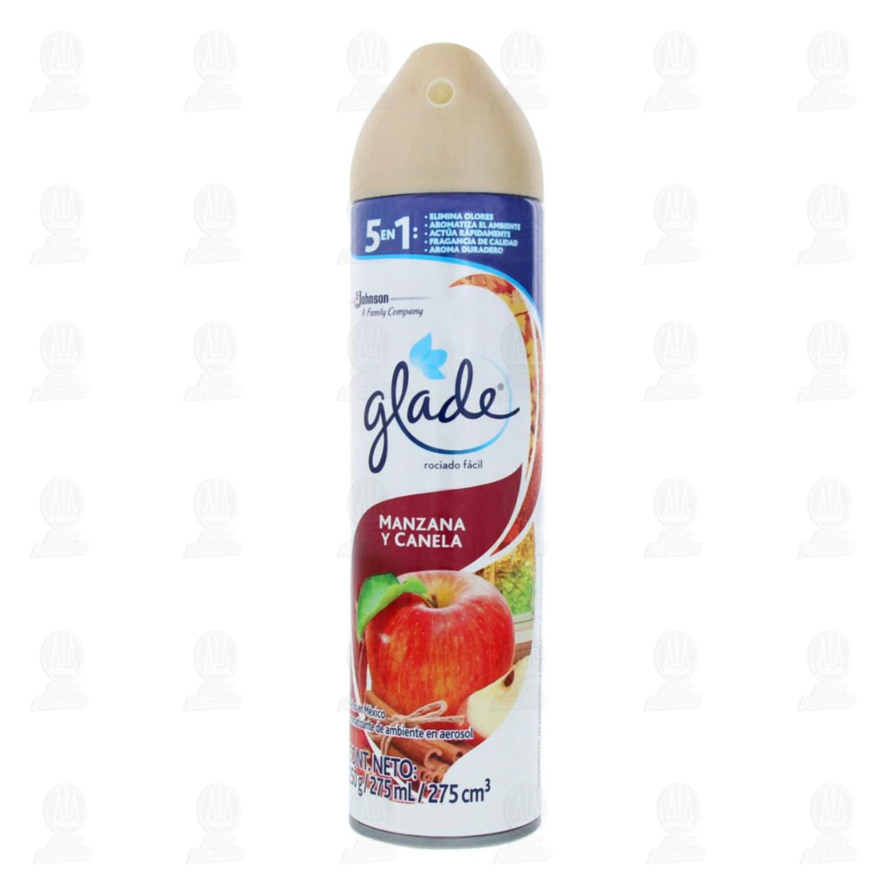 Aromatizante ambiental Glade en aerosol, aroma manzana y canela, de fácil rociado. Envase de 275 mililitros.