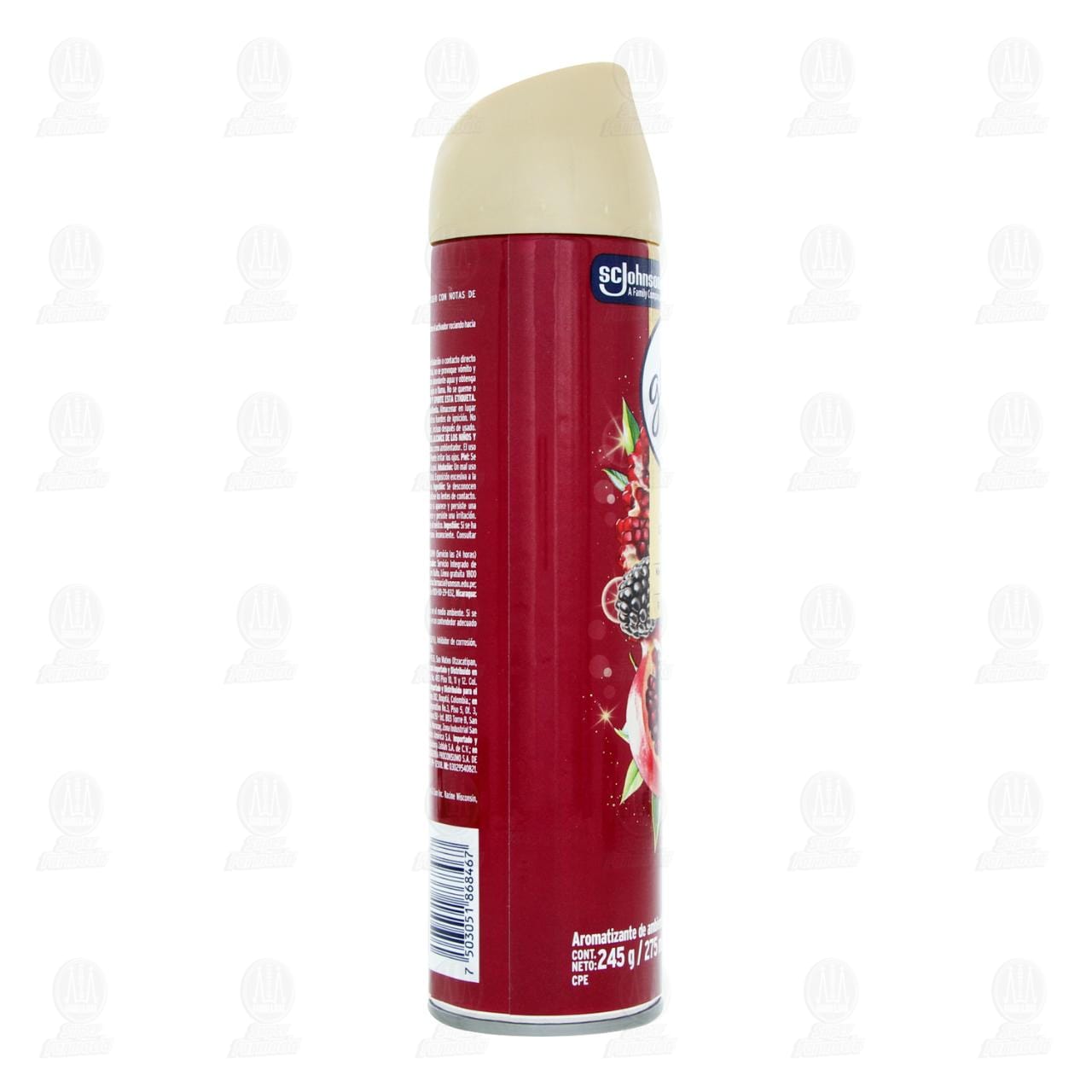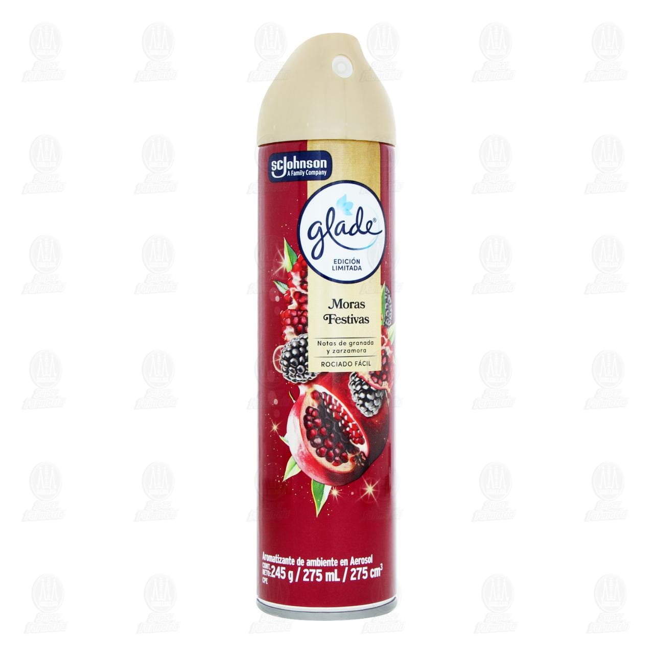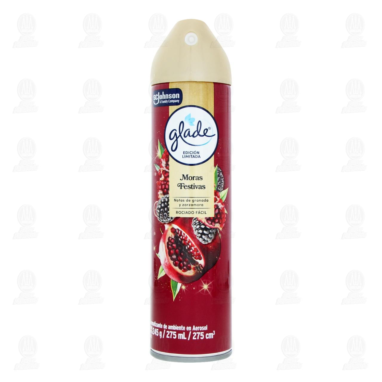 Aromatizante Glade Moras Festivas en Aerosol con notas de granada y zarzamora, edición limitada que perfuma el ambiente con una fragancia dulce y frutal inspirada en la temporada navideña. Contiene 275 mililitros.