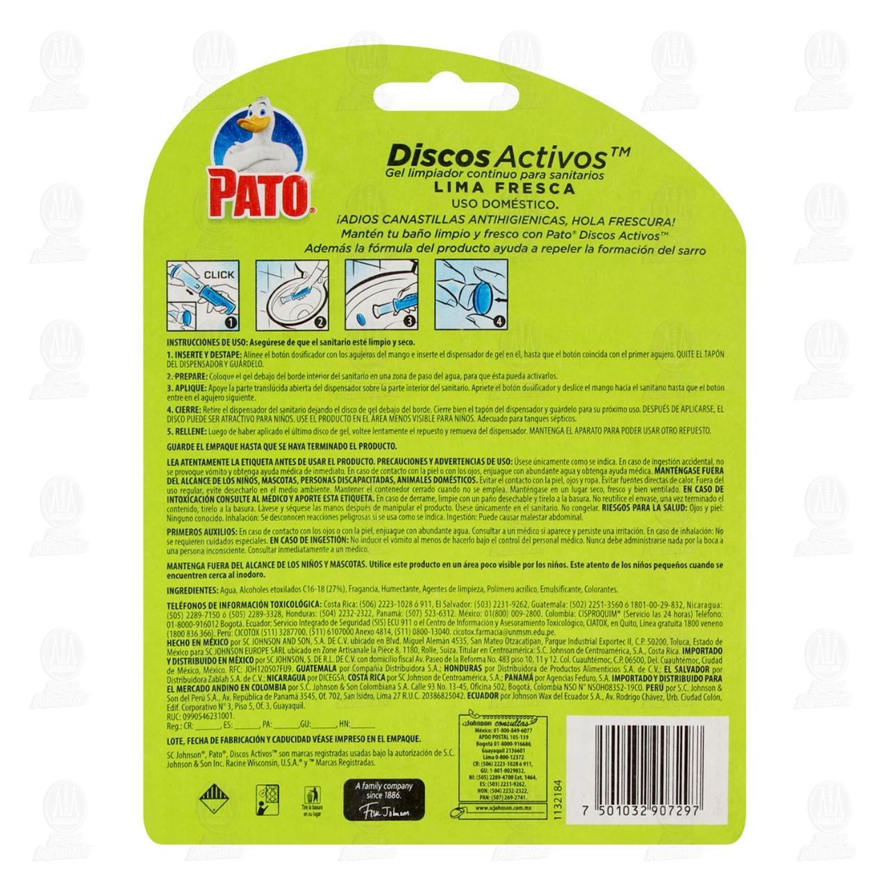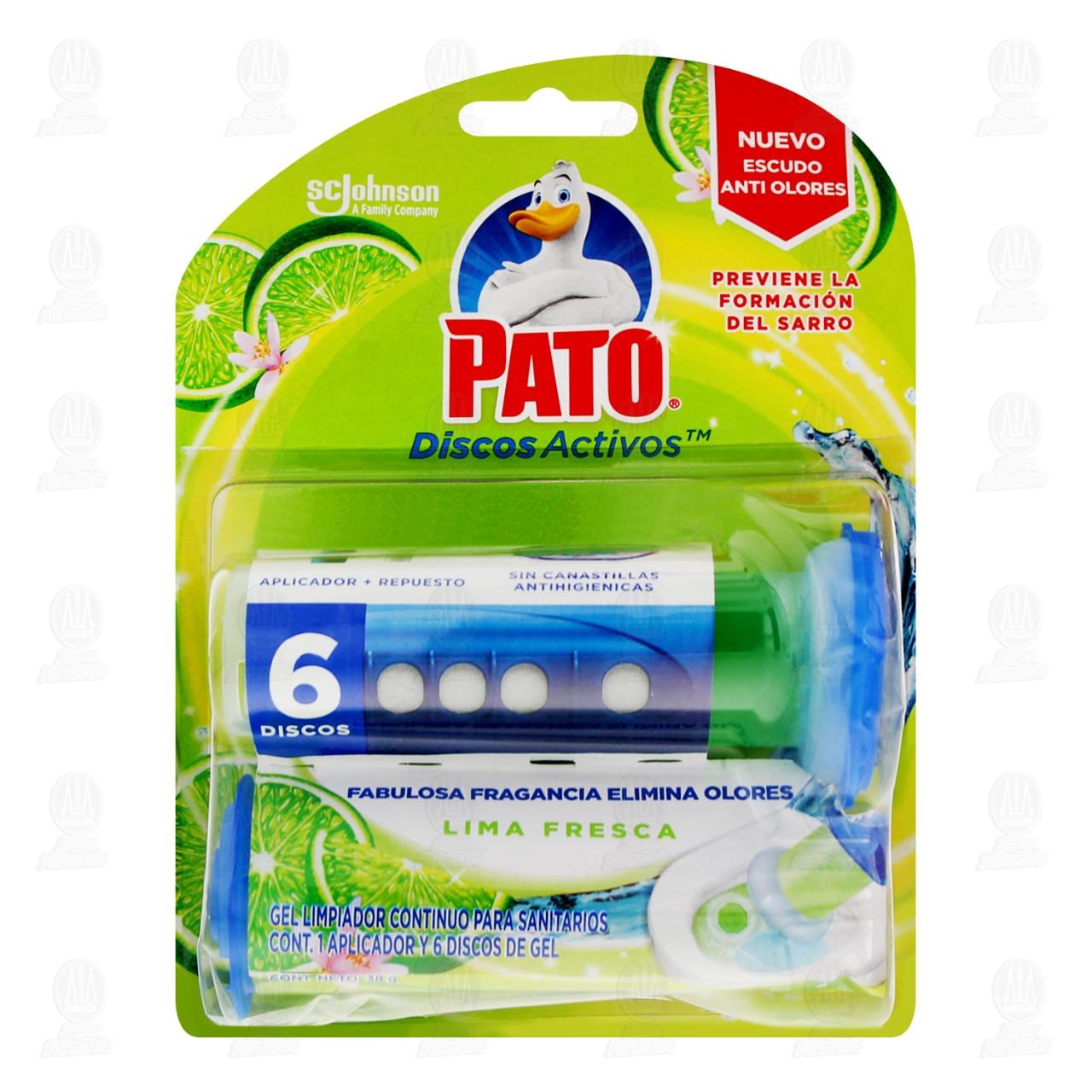 Gel limpiador Pato para sanitarios con aroma a lima fresca, discos activos que combaten las manchas y se aplican fácilmente. Contiene 36 mililitros (1 aplicador y 6 discos de gel de 6 mililitros cada uno).