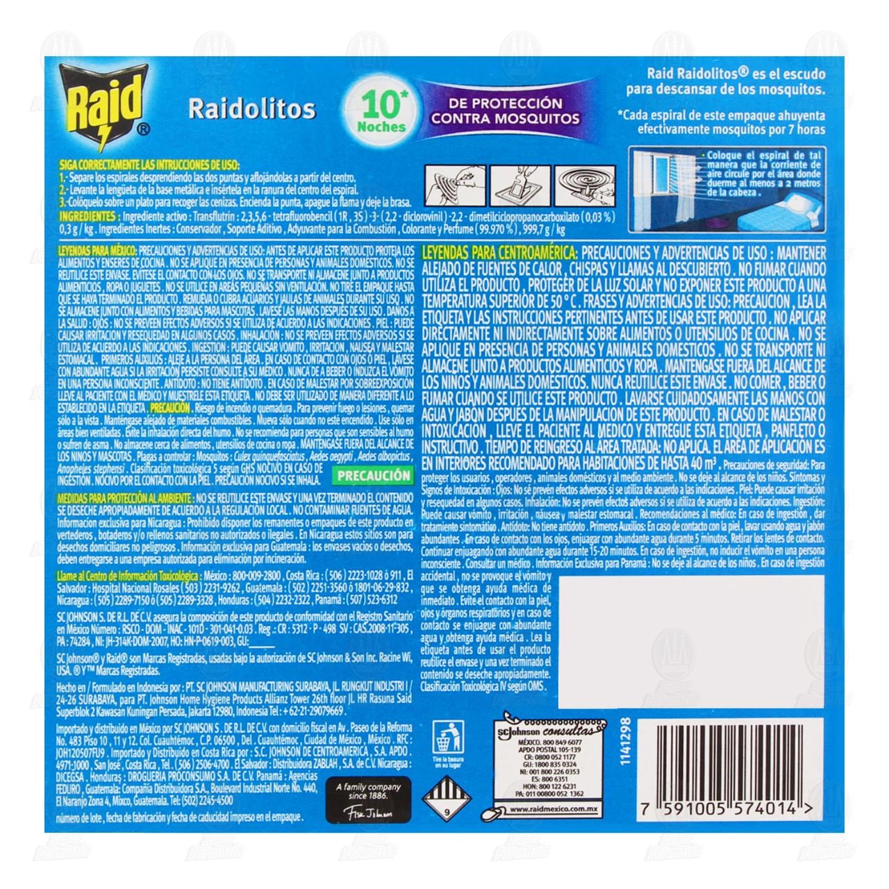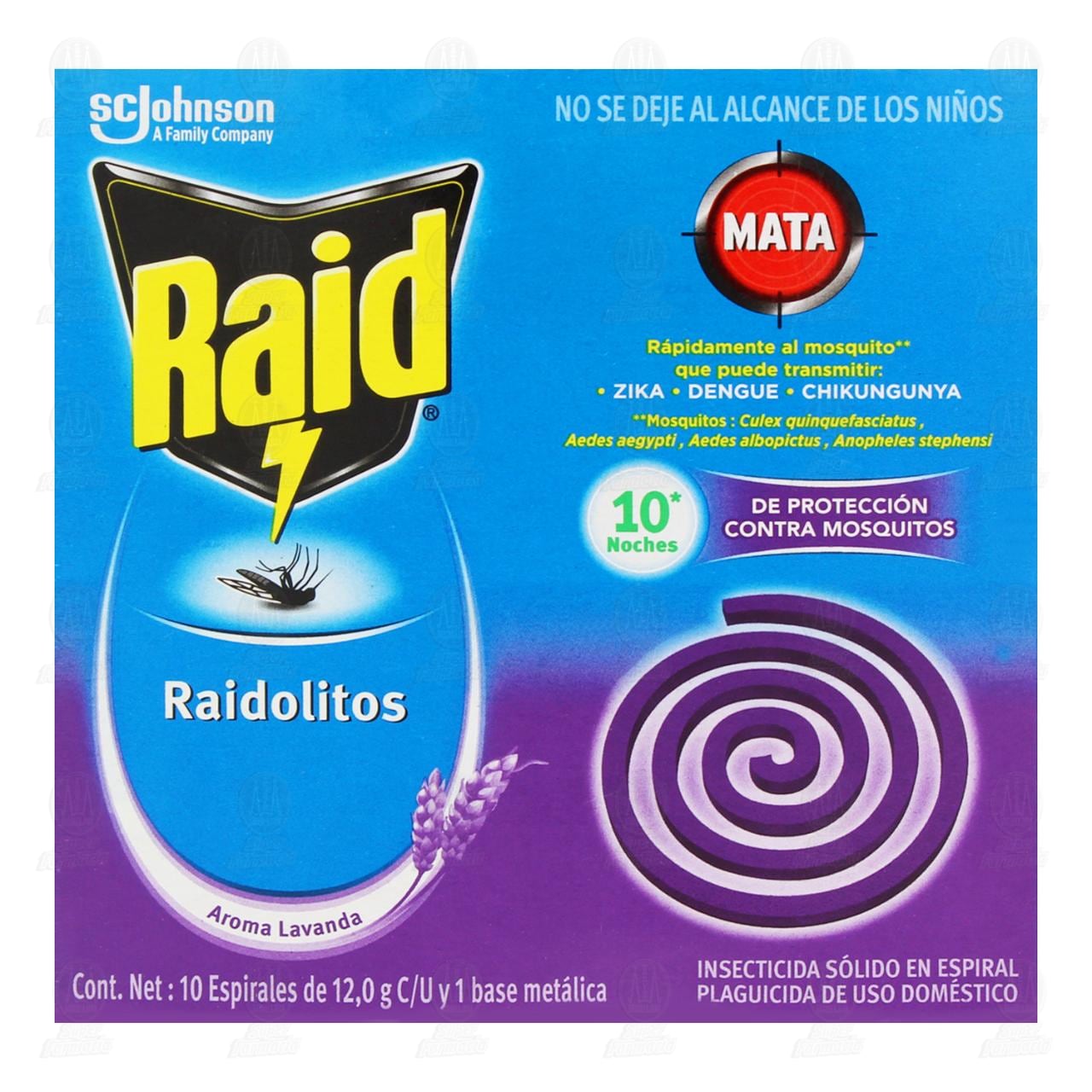 Insecticida Raid raidolitos sólido en forma de espiral con agradable aroma a lavanda, mata rápidamente al mosquito que puede transmitir: Zica, Dengue y Chikungunya. Caja con 10 piezas de 12 gramos cada una + 1 base metálica.