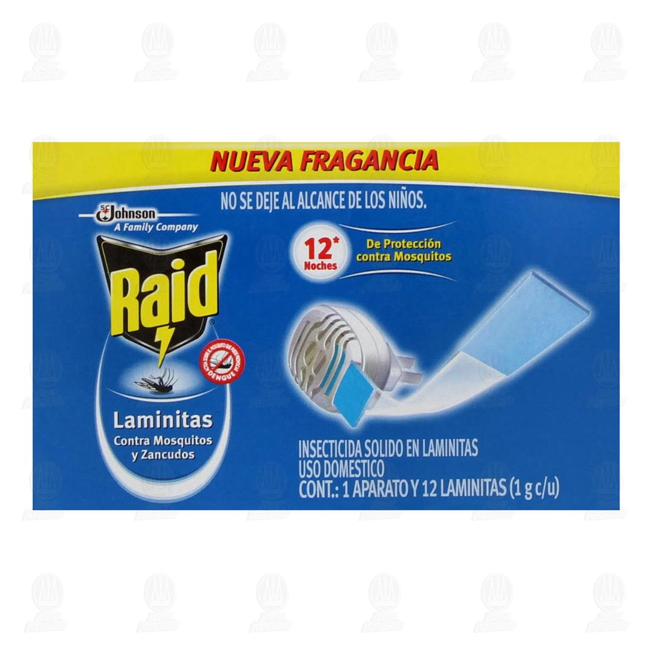 Insecticida Raid sólido en laminitas para uso doméstico, 12 noches de protección. Contiene 1 aparato vaporizador y 12 laminitas de 1 gramo cada una.