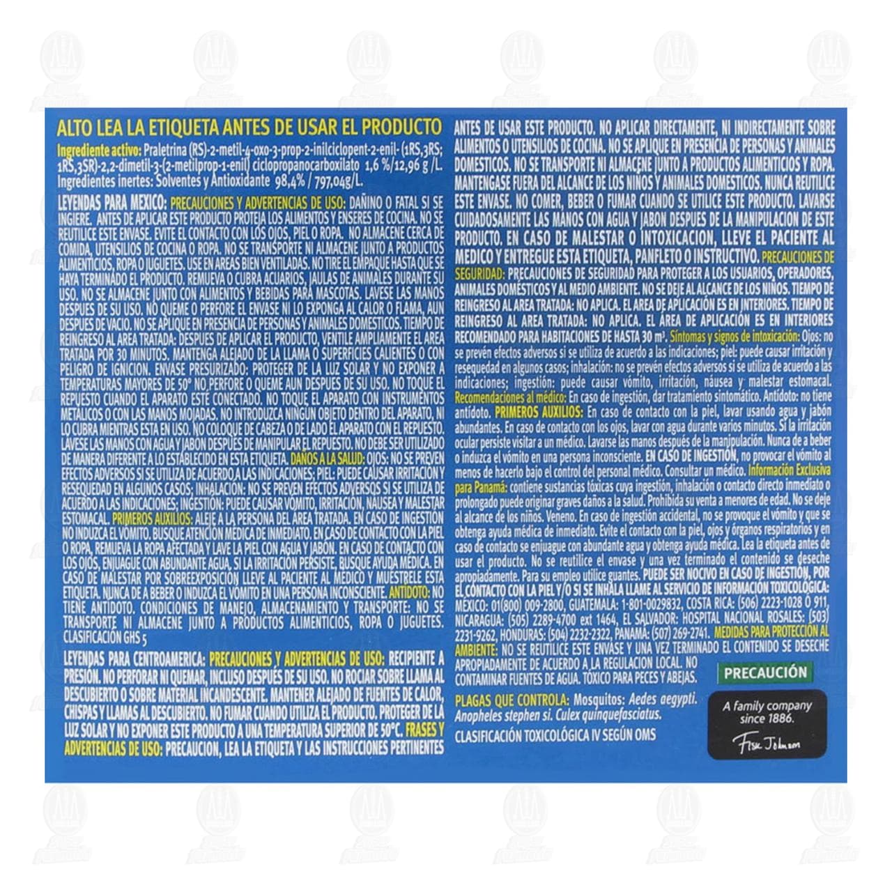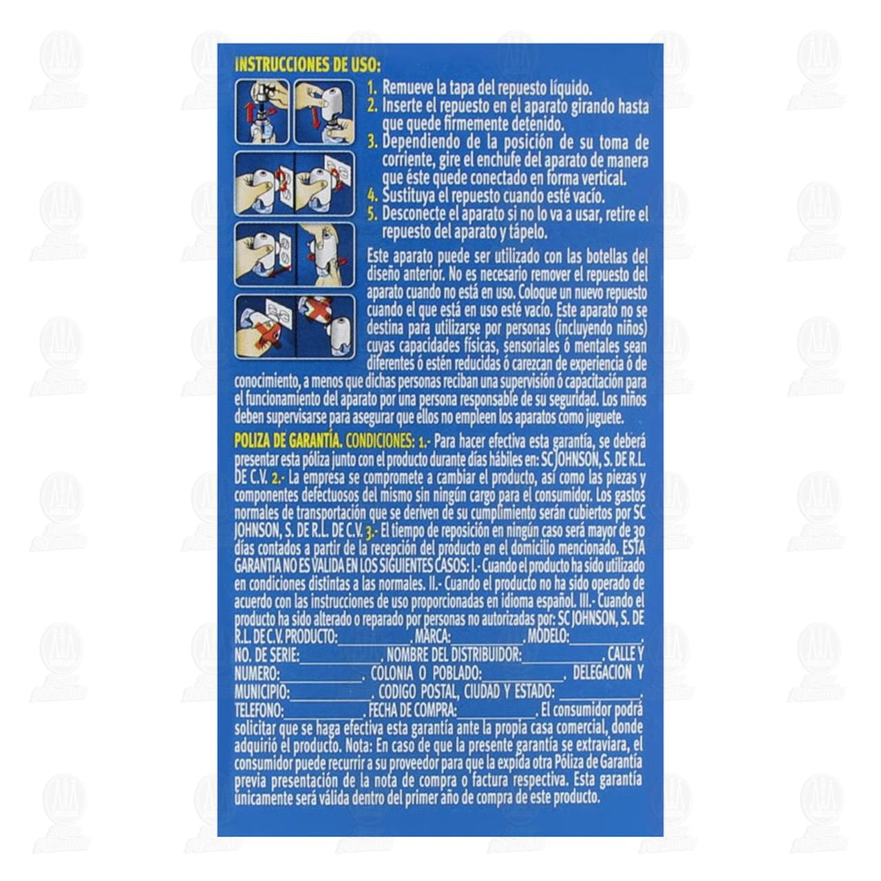 Dañino o fatal si se ingiere. Antes de aplicar este producto proteja los alimentos y enseres de cocina. No se reutilice este envase, evite el contacto con los ojos, piel o ropa. No almacene cerca de comida, utensilios de cocina o ropa. No se transporte ni almacene junto a productos alimenticios, ropa o juguetes. Use en áreas bien ventiladas. No tire el empaque hasta que se haya terminado el producto. Remueva o cubra acuarios, jaulas de animales durante su uso. No se almacene junto con alimentos y bebidas para mascotas. Lávese las manos después de su uso. No queme o perfore el envase ni lo exponga al calor o flama, aún después de vacío. No se aplique en presencia de personas y animales domésticos. Tiempo de reingreso al área tratada: después de aplicar el producto, ventile ampliamente el área tratada por 30 minutos. Mantenga alejado de la llama o superficies calientes o con peligro de ignición. Envase presurizado: Proteger de la luz solar y no exponer a temperaturas mayores de 50° no perfore o queme aún después de su uso. No toque el repuesto cuando el aparato esté conectado. No toque el aparato con instrumentos metálicos o con las manos mojadas. No introduzca ningún objeto dentro del aparato, ni lo cubra mientras está en uso. No coloque de cabeza o de lado el aparato con el repuesto. Lávese las manos con agua y jabón después de manipular el repuesto. No debe ser utilizado de manera diferente a lo establecido en esta etiqueta. Daños a la salud: Ojo: No se prevén efectos adversos si se utiliza de acuerdo a las indicaciones. Piel: puede causar irritación y resequedad en algunos casos. Inhalación: No se prevén efectos adversos si se utiliza de acuerdo a las indicaciones. Ingestión: Puede causar vómito, irritación, náusea y malestar estomacal.Detalles del producto