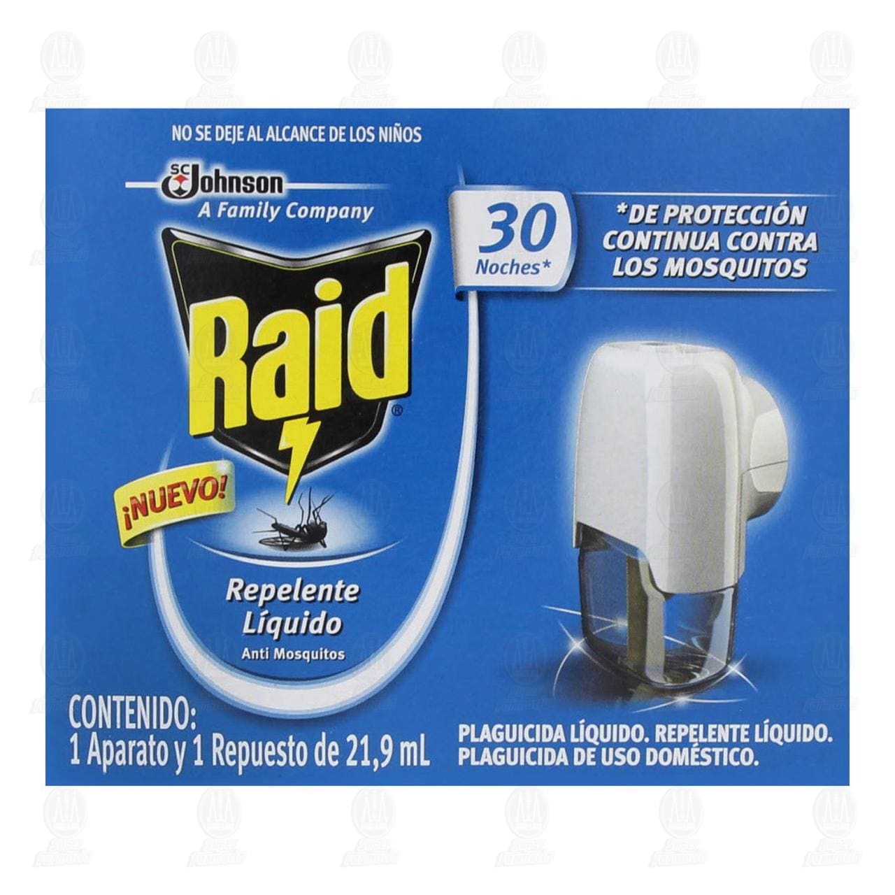 Insecticida Raid Repelente Líquido Anti Mosquitos con Aparato Eléctrico, protección continua durante 30 noches. Contiene 2 piezas (1 aparato electrónico y 1 repuesto de 21.9 mililitros).
