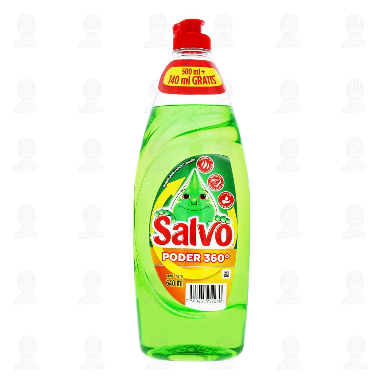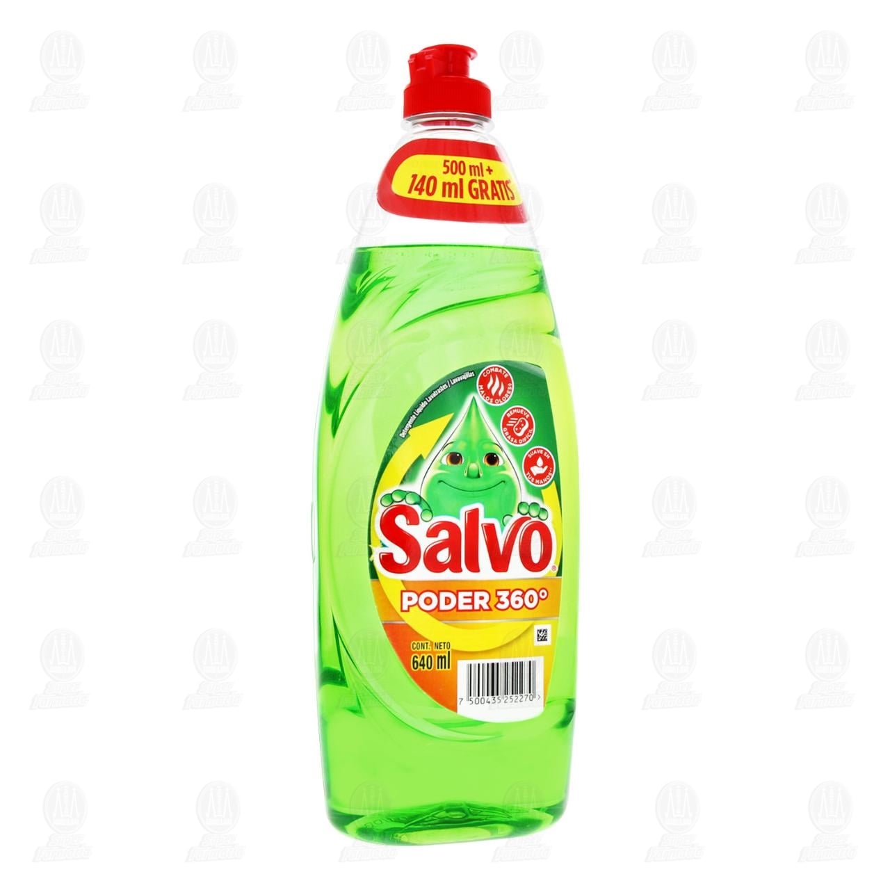 Detergente Líquido Lavatrastes Salvo Poder 360°, Combate malos olores y remueve grasa difícil. Envase con 640 mililitros.