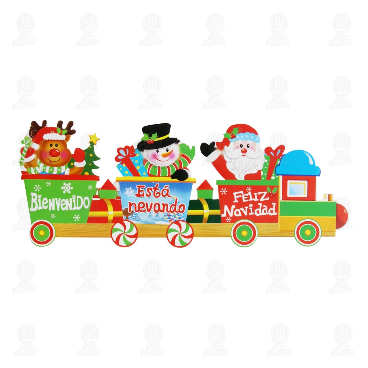 Figura Navideña Bridgeco tipo letrero elaborada en foami con diseño de tren decorativo, ideal para colgar en puertas, paredes o ventanas durante la temporada decembrina. Contiene 1 pieza de 42 x 16 centímetros.