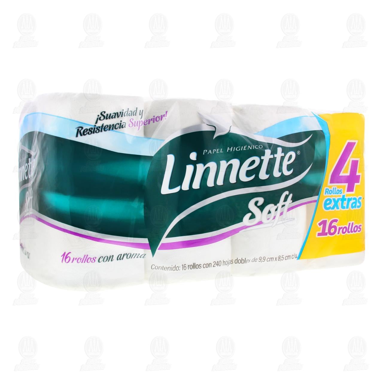 Papel higiénico Linnette Soft con aroma, suavidad y resistencia superior. Paquete con 16 piezas (12 + 4 extras) de 240 hojas dobles.