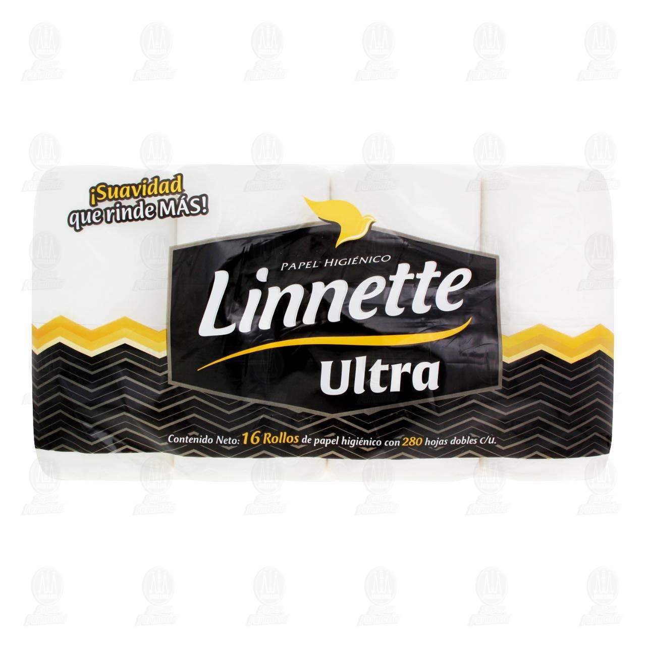 Papel Higiénico Linnette Ultra, suavidad que rinde más. Contiene 16 rollos con 280 hojas dobles cada uno.
