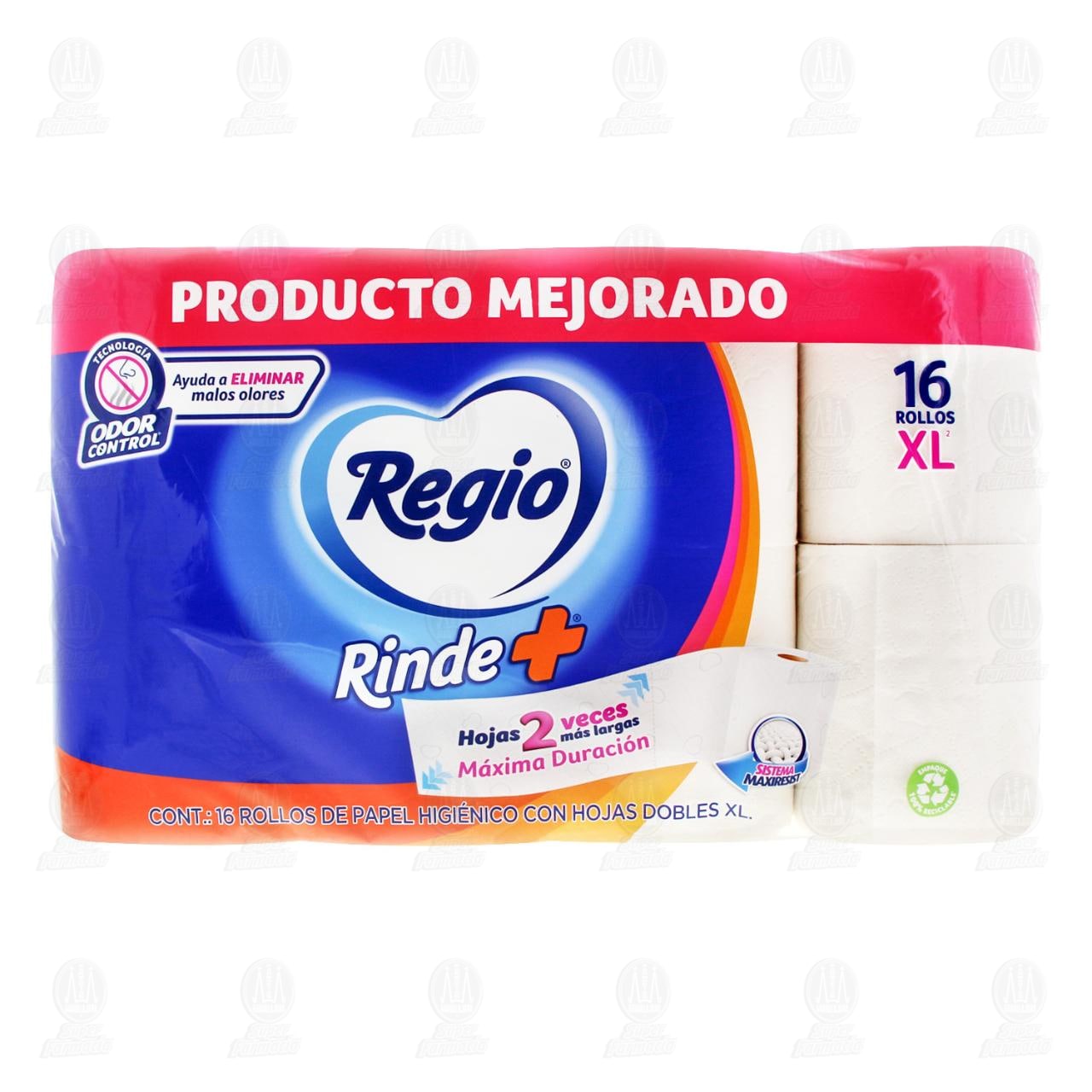 Papel Higiénico Regio Rinde Más con hojas 2 veces más largas y máxima duración con tecnología odor control que ayuda a eliminar malos olores. Paquete con 16 rollos de 109 hojas dobles XL.