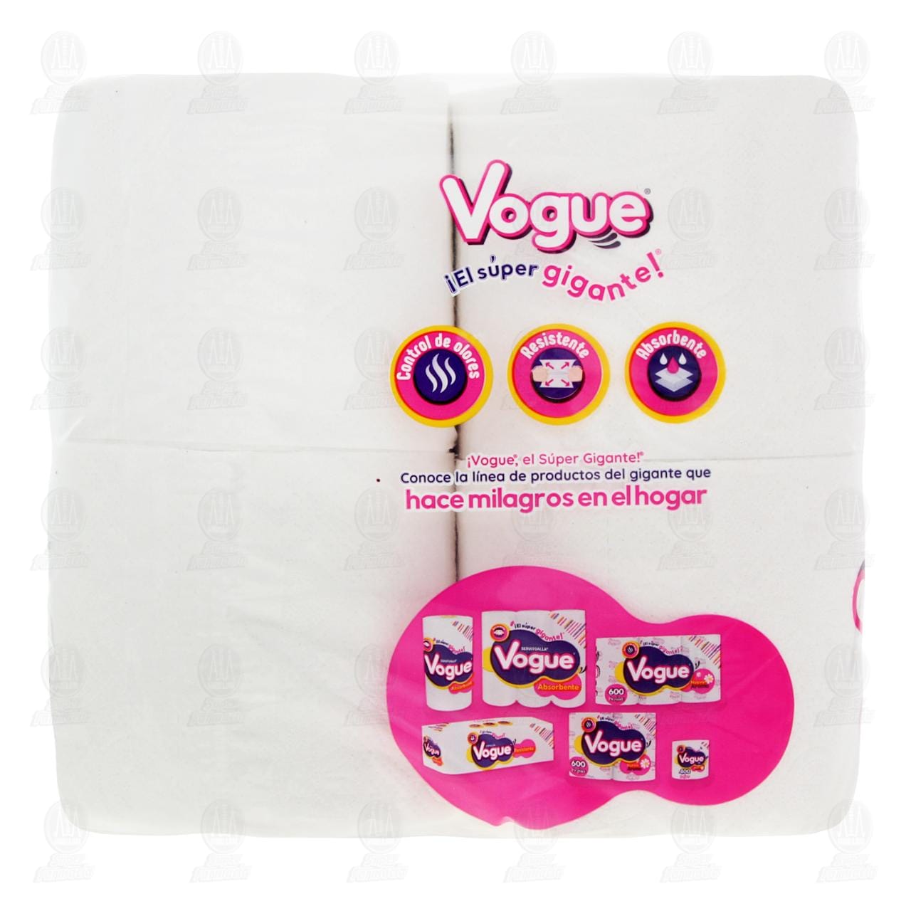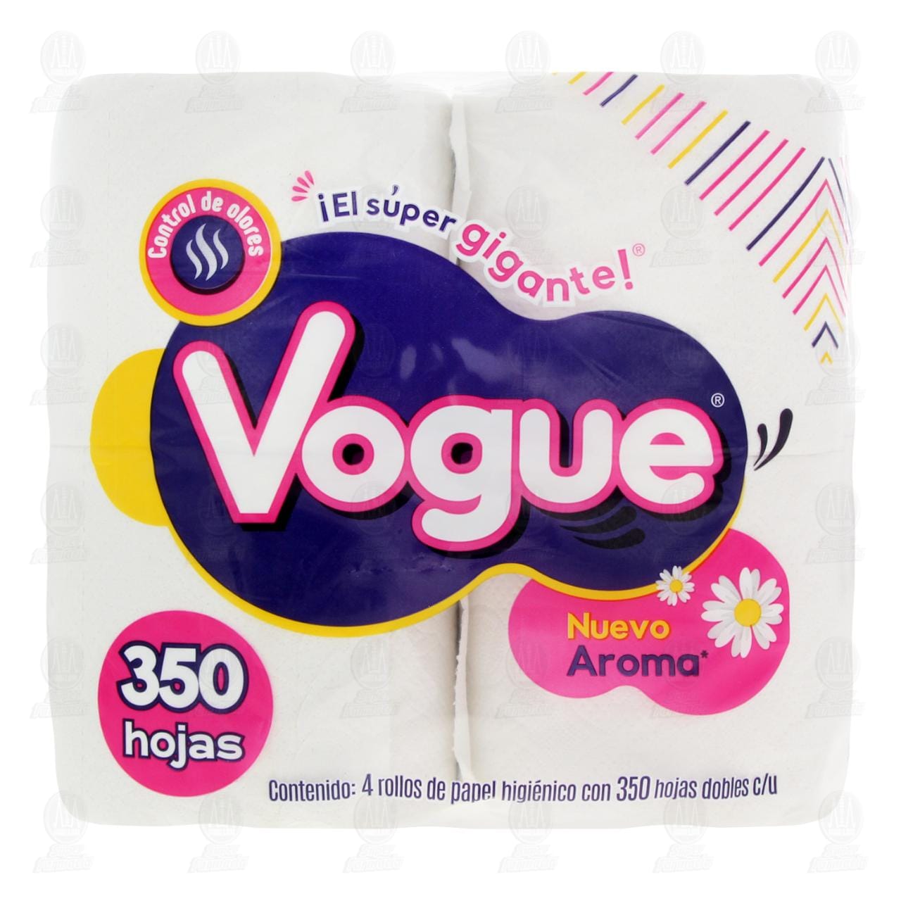 Papel Higiénico Vogue, El súper gigante con nuevo aroma. Paquete de 4 rollos con 350 hojas dobles cada uno.