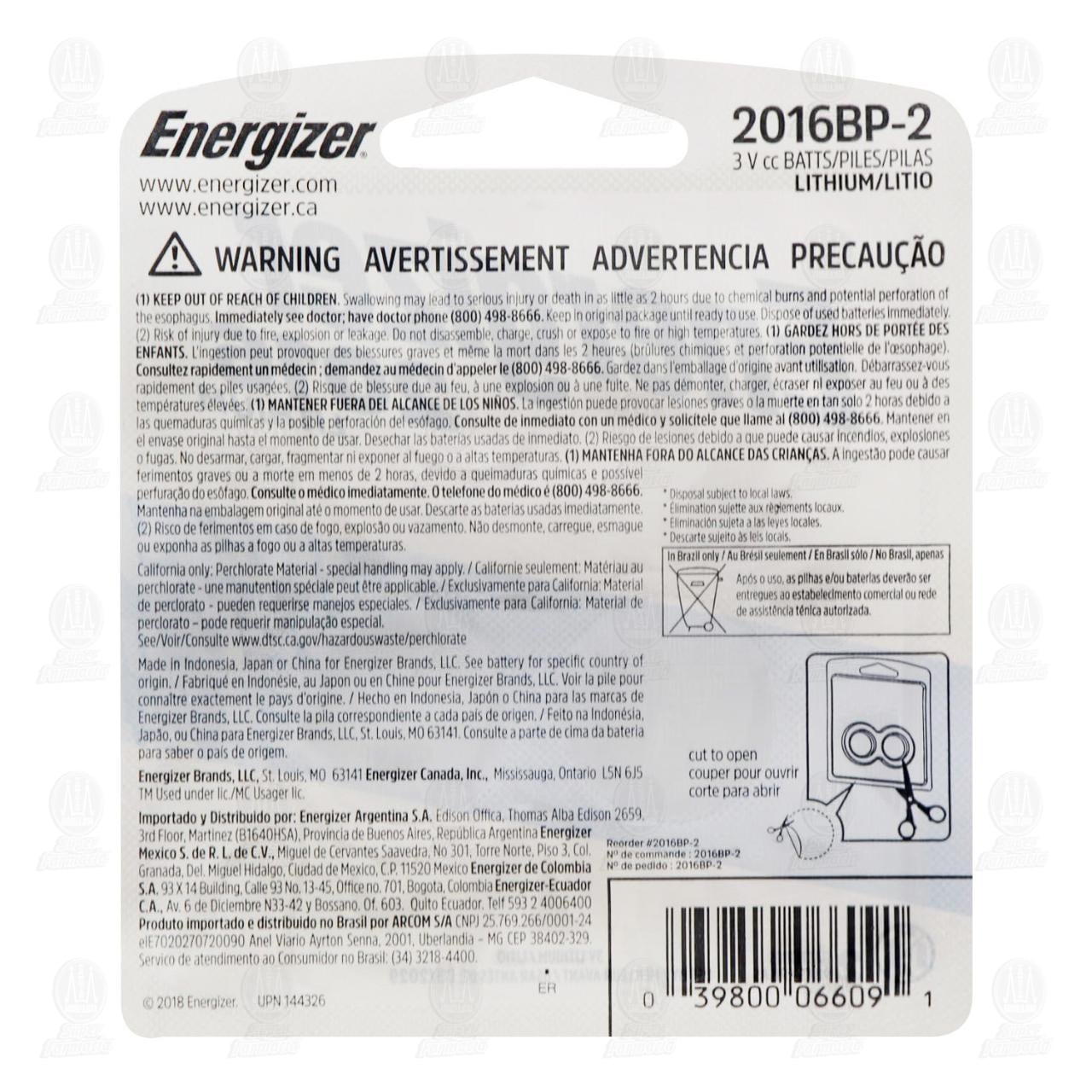 Pilas de litio Energizer 2016 de 3V ZeroMercury. Contiene 2 piezas.