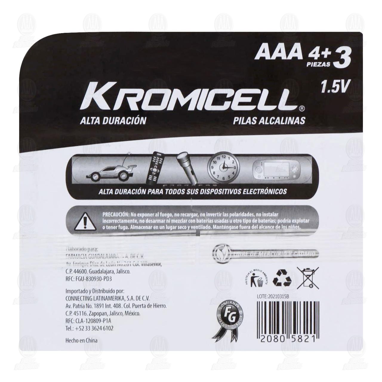 Pilas alcalinas Kromicell AAA de 1.5V, alta duración para tus dispositivos electrónicos. Contiene 7 piezas (4 + 3 gratis).
