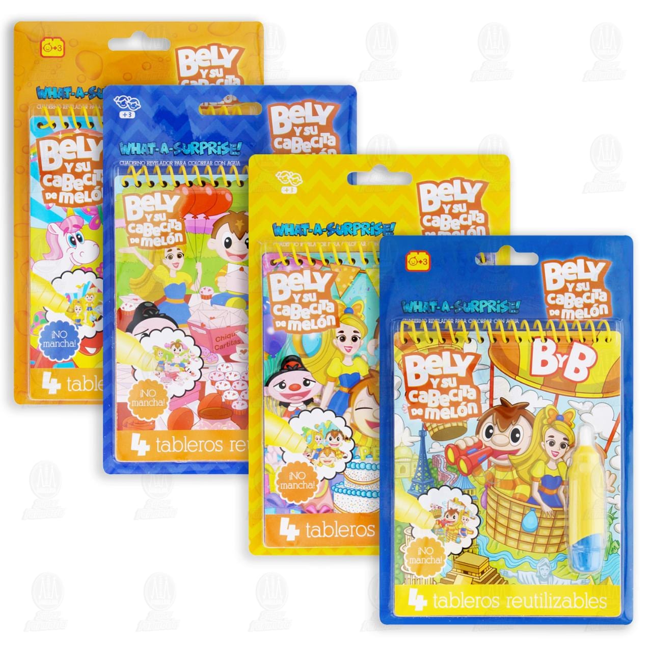 Cuaderno Revelador Bely y su Cabecita de Melón para Colorear con agua, para niños mayores de 3 años. Varios diseños. Contiene 2 piezas: 1 cuaderno de colorear (con 4 tableros reutilizables) y 1 Pluma de agua.