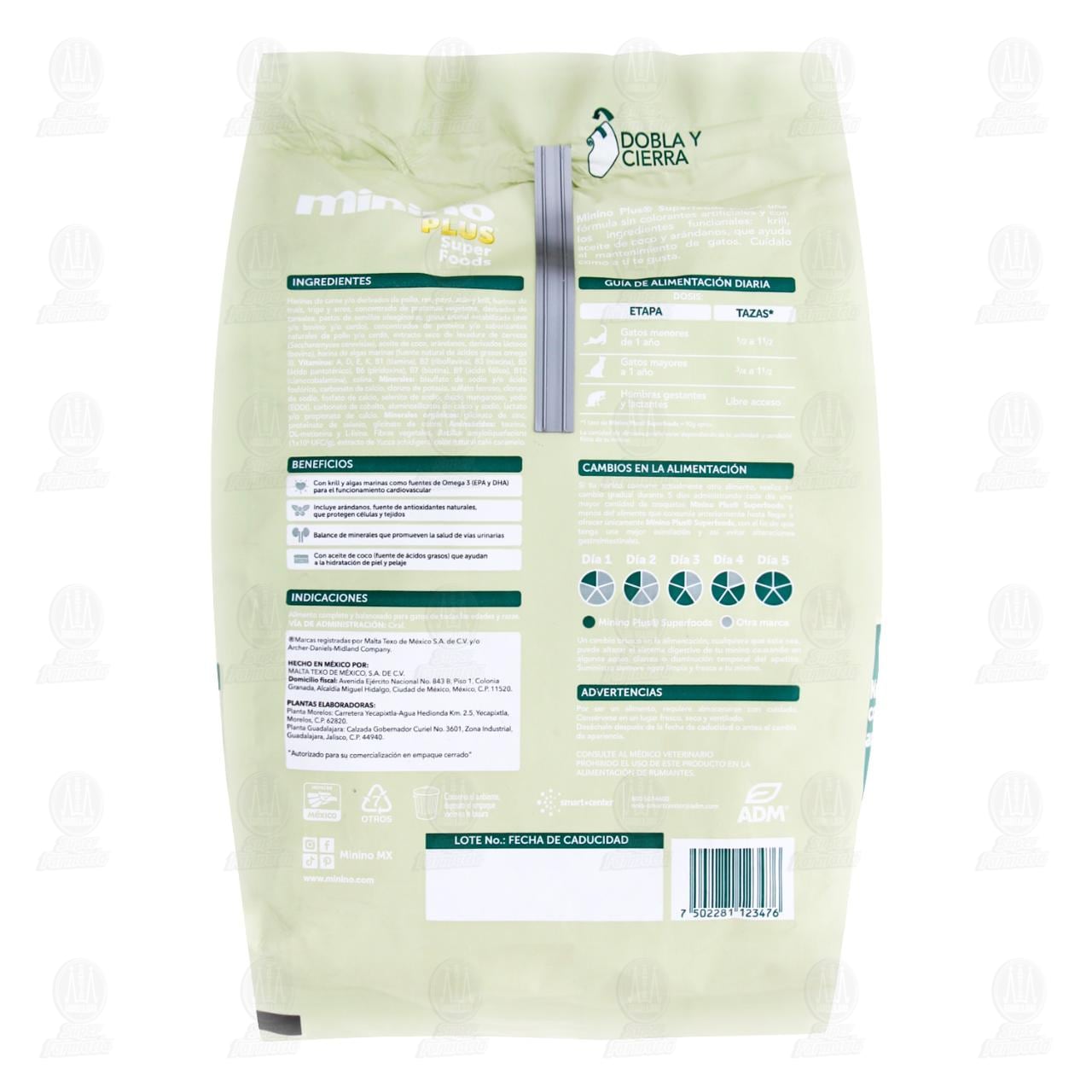 Croquetas Minino Plus Super Foods para Gatos con 32% de Proteína sin Colorantes Artificiales y con los Ingredientes Funcionales: Krill, Coco y Arándano. Bolsa con 1.3 kilogramos.