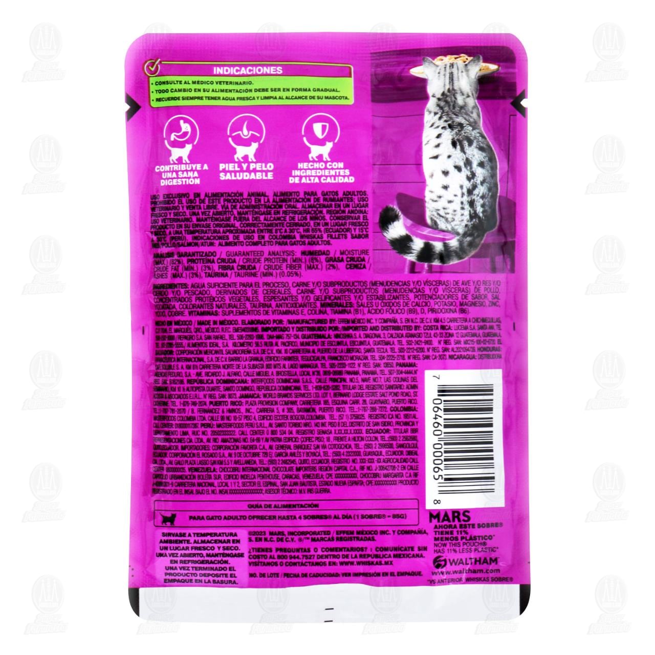 Fillets con Pollo Whiskas completo y balanceado para gatos adultos de 1 año en adelante con ingredientes naturales, vitaminas y minerales. Sobre con 85 gramos.
